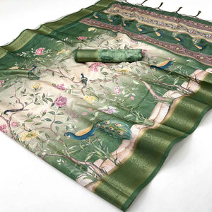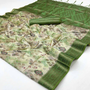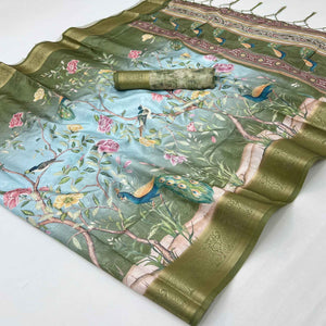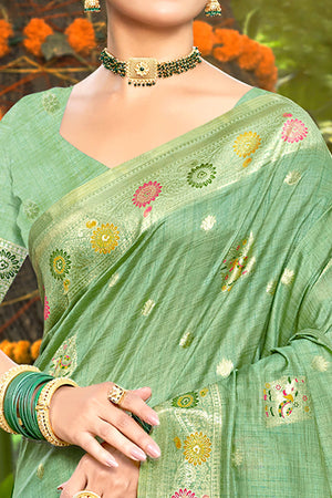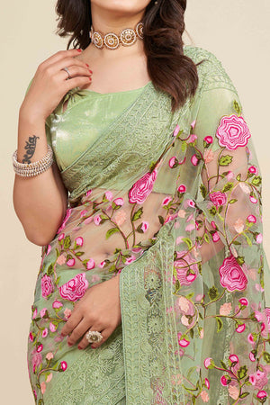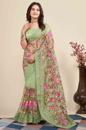 The best part about green sarees are that they are so exquisite in its texture which helps them to blend with any work added on it be it a heavy embellished border, a full mirror work on pallu, or cut-dana motifs all of them looks extremely gorgeous.