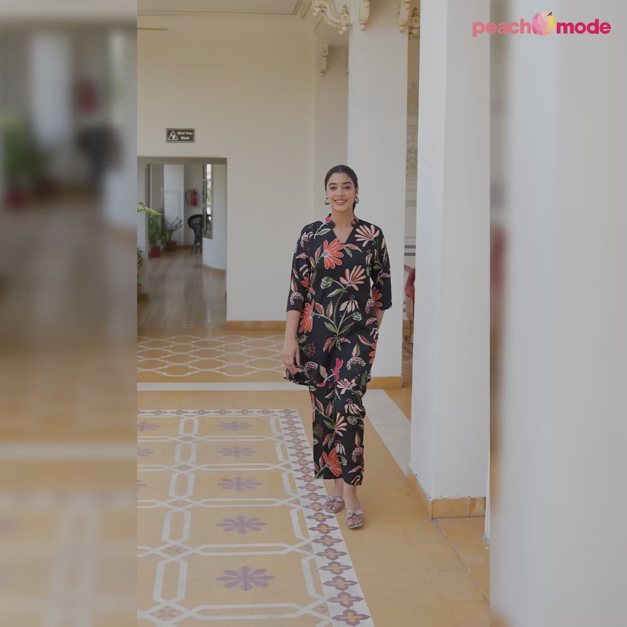 Black colored co ord set is prettified with floral printed work as shown which makes it appear classy. This top is made of muslin fabric which is accompanied with muslin bottom. Women can buy this set to wear for their casual, daily and office.