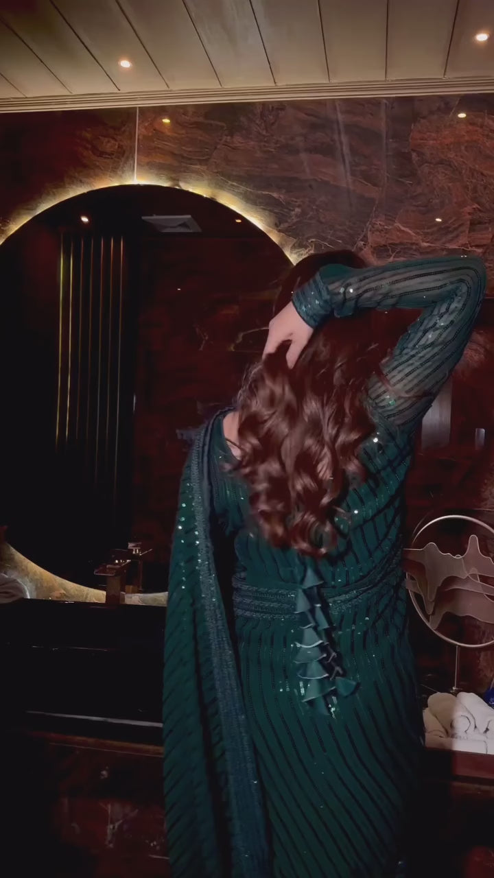 - Vibrant Elegance: Green colored saree adorned with beautiful all-over sequins embroidery, showcasing a glamorous and sophisticated style as shown.