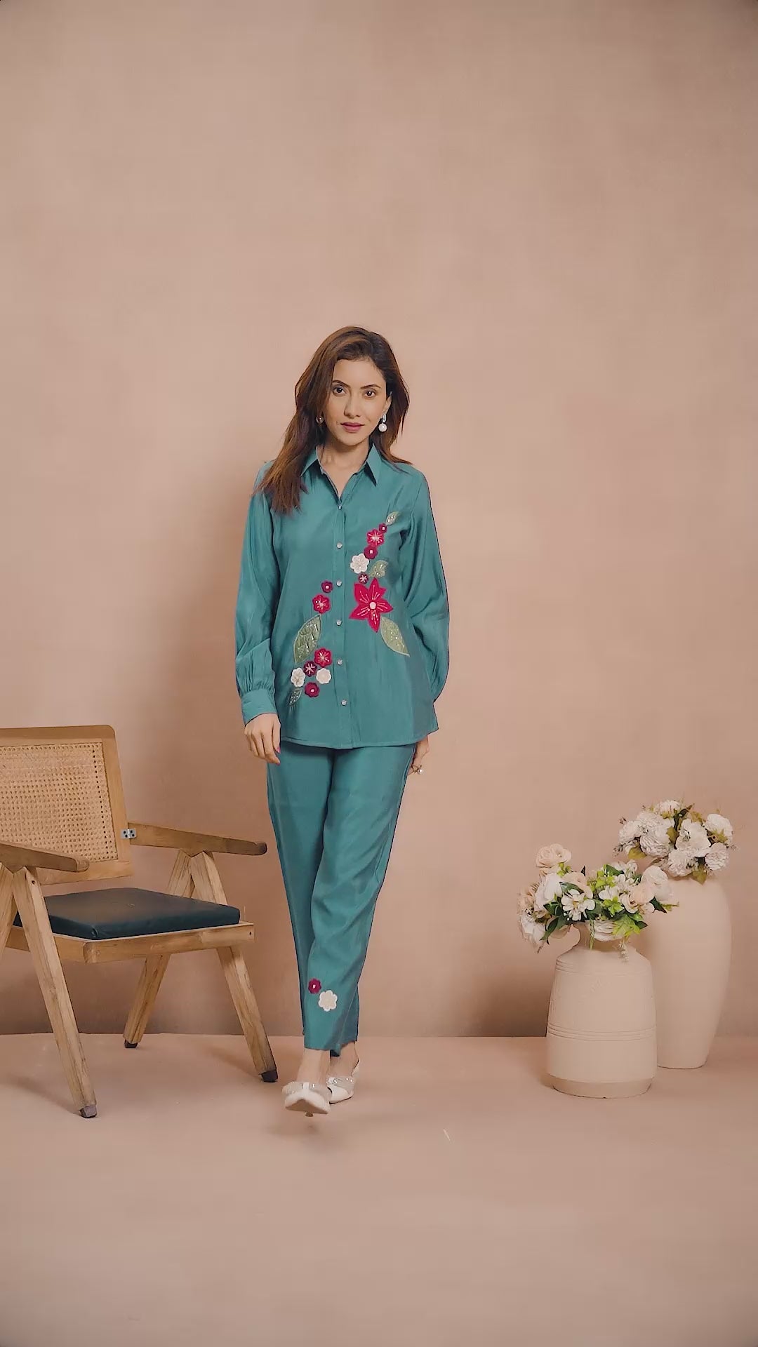 - Details: Dark teal co-ord set featuring exquisite floral patchwork and delicate stone embellishments, making it a sophisticated and stylish choice.