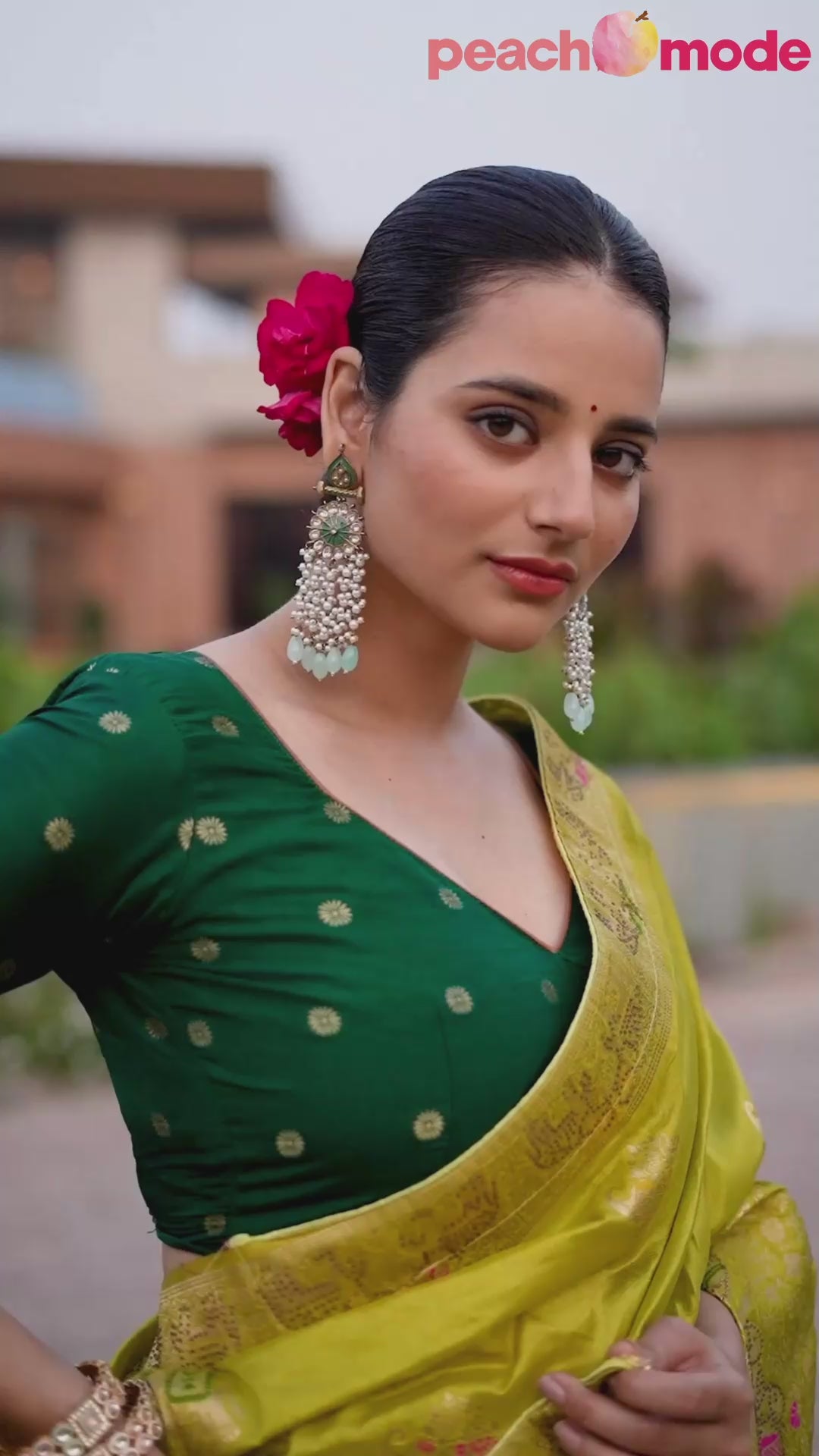 - Exquisite Elegance: let your style shine with this enchanting green color saree, designed to radiate charm and grace. Featuring delicate floral zari weaving, intricate triple meenakari detailing, Swarovski embellishments, and a tassel-bordered finish, it exudes luxurious appeal—perfect for grand occasions.