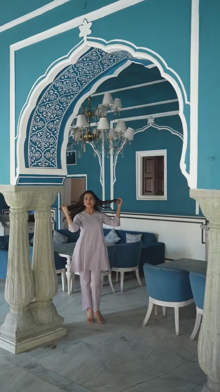 Lavender colored co-ord set is prettified with self design dobby work as shown which makes it appear classy. This top is made of pure cotton fabric which is accompanied with pure cotton pant. Women can buy this set to wear for their casual and office wear.