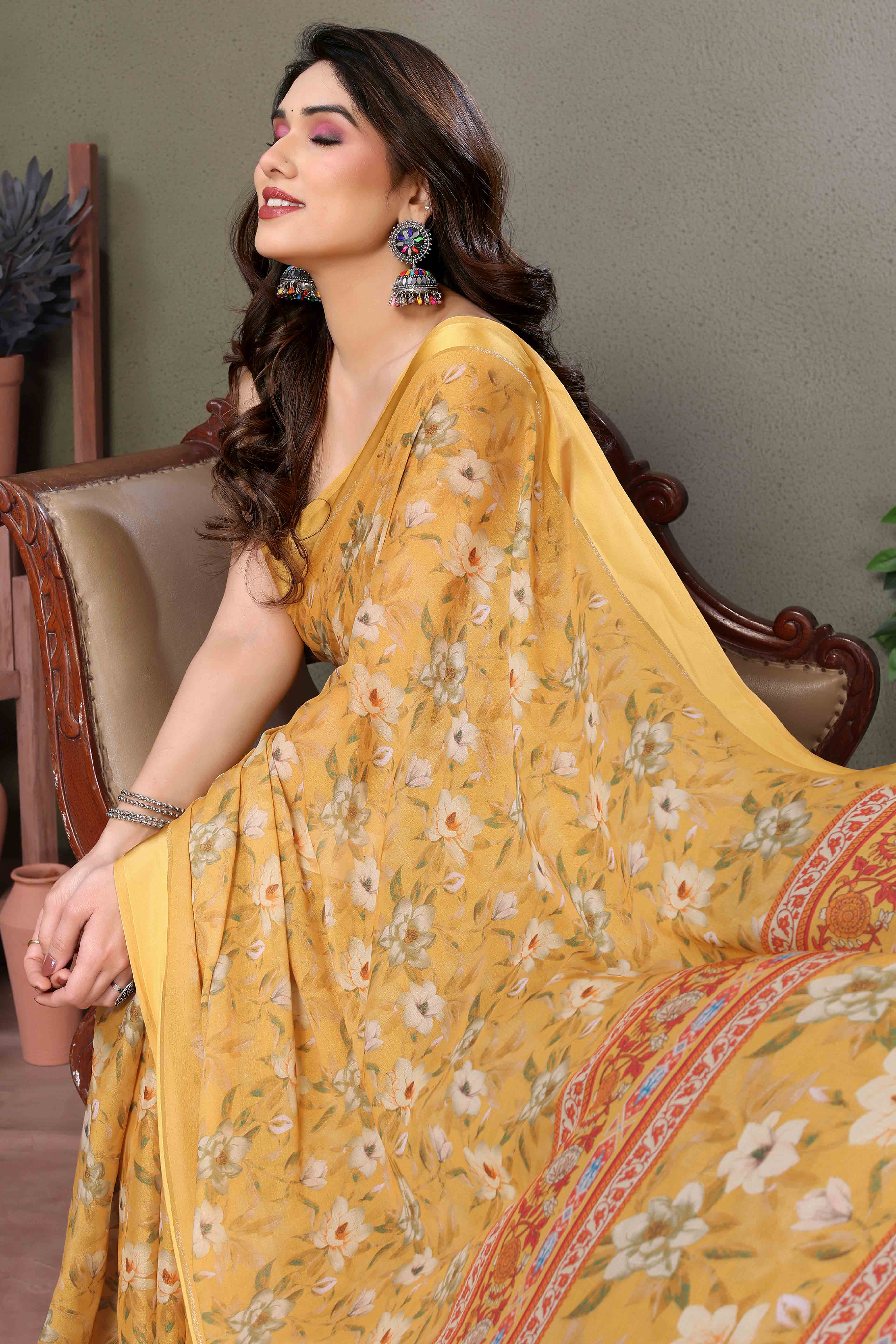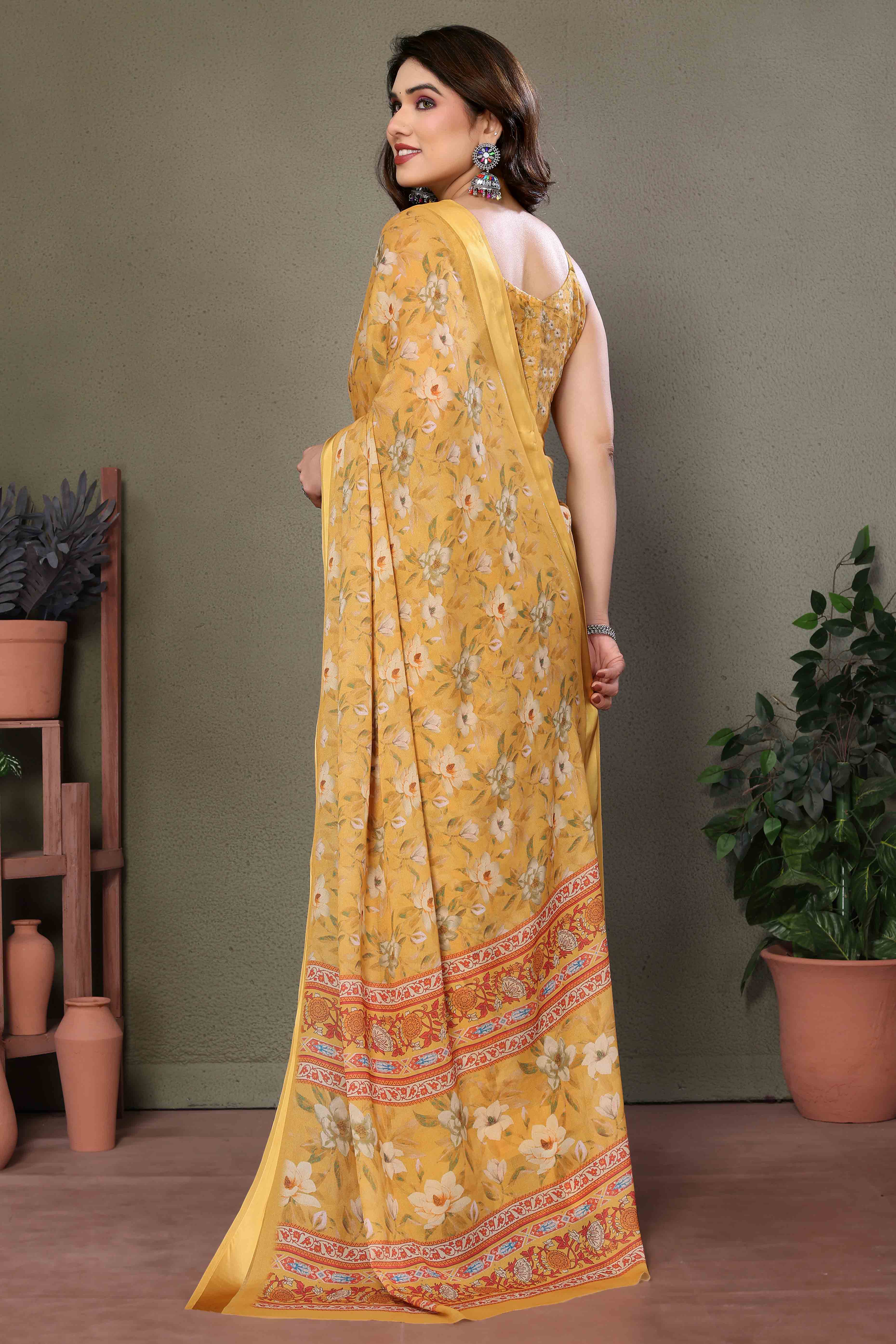 Mustard colored saree is made from chiffon fabric which is highlighted with beautiful floral print work as shown. Comes along with unstitched chiffon blouse piece which you can customize as per your design/style. Occasion - You can wear this saree for casual and daily.