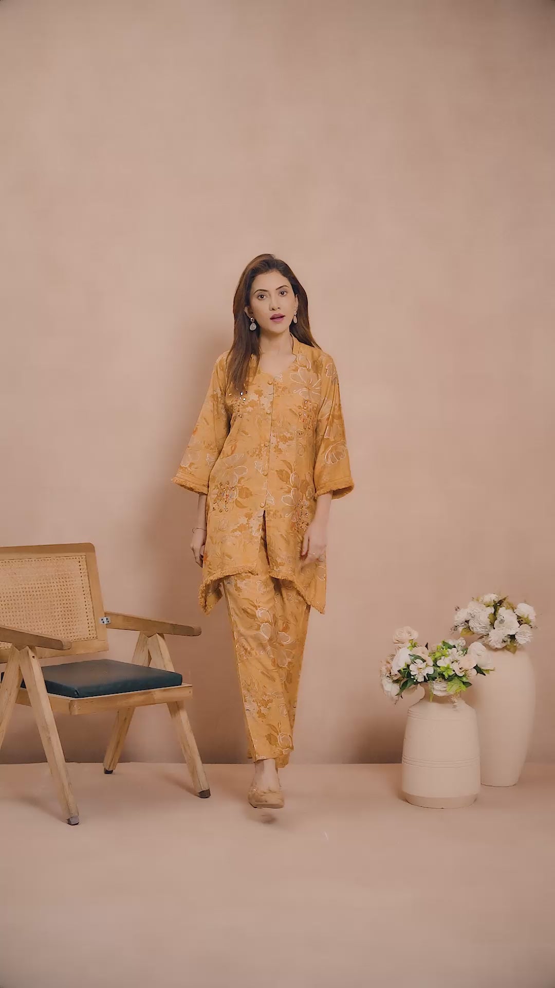 - Details: This stylish mustard co-ord set showcases intricate mirror work and floral prints, adding a touch of elegance.