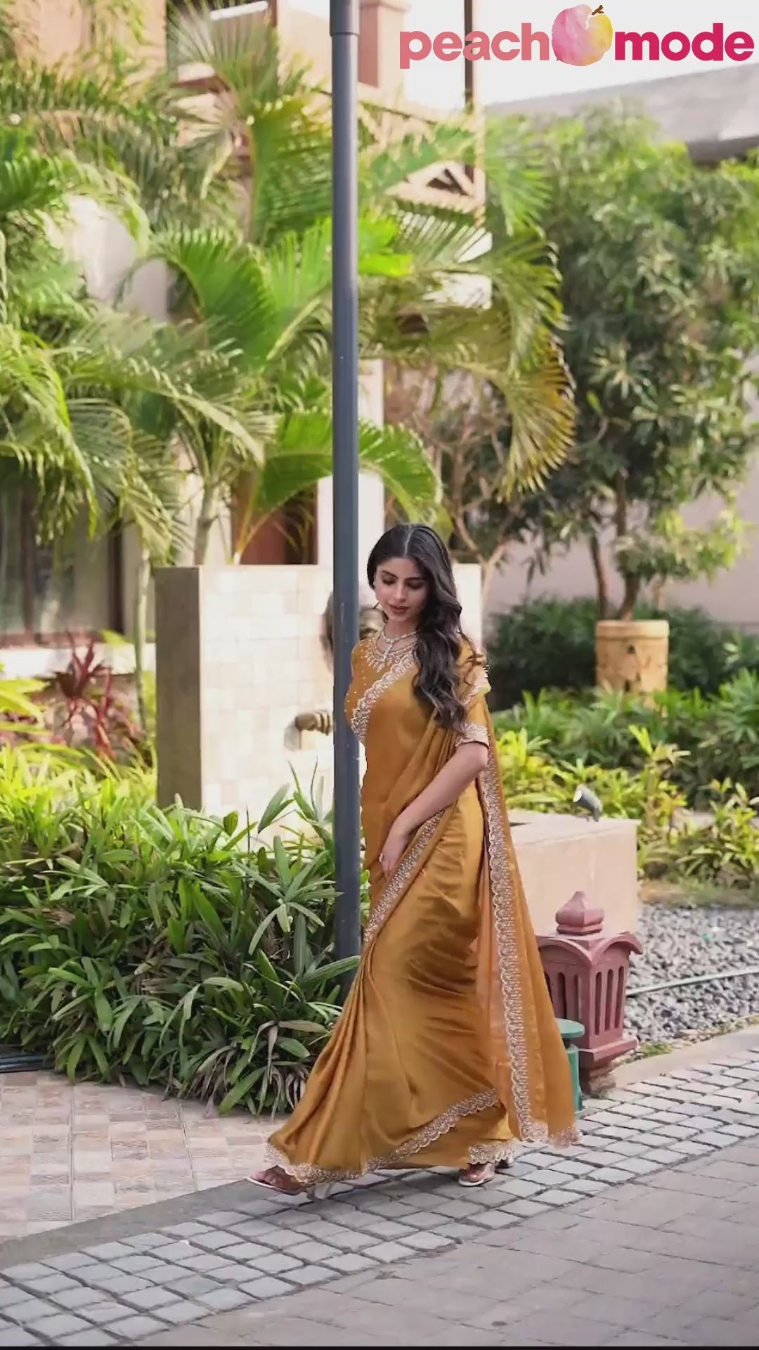 Mustard Solid Satin Chiffon Saree With Cutdana & Zarkan Handwork