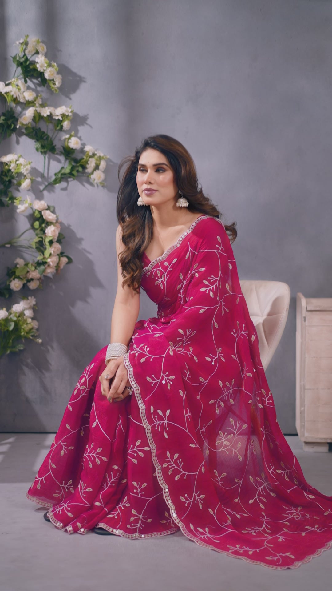 - Chic Elegance: Drape yourself in refined charm with this stunning pink color saree, adorned with delicate floral sequins embroidery and an artistic cutwork border for a look that’s both modern and timeless.