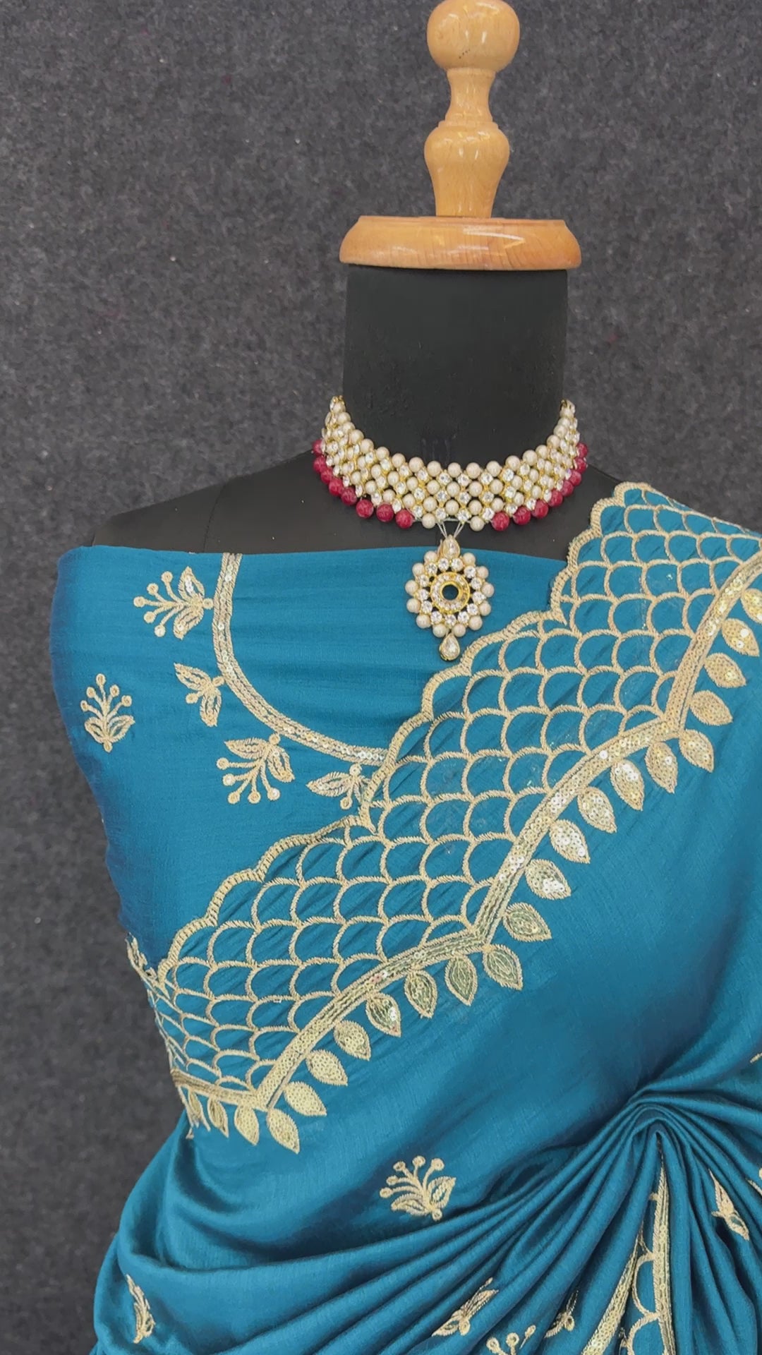 Teal colored saree is made from vichitra silk fabric which is highlighted with sequins embroidered as shown. Comes along with unstitched vichitra silk blouse piece which you can customize as per your design/style. Occasion - You can wear this saree for party and functions.
