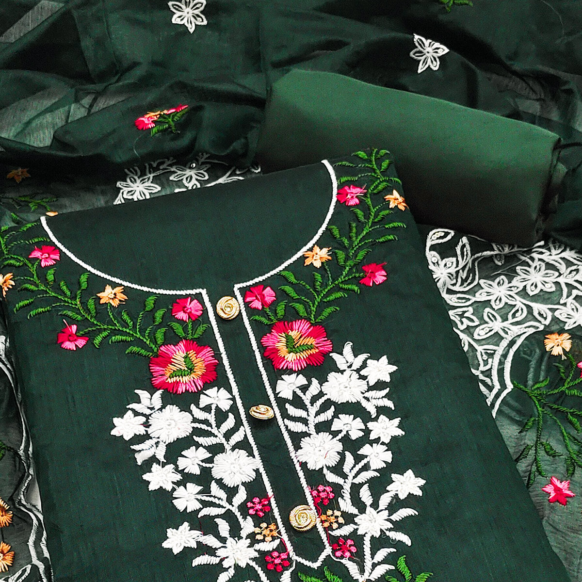Product Details: Step into elegance with this pristine Bottle Green suit, delicately adorned with floral thread embroidery and shimmering sequins that exude sophistication.
