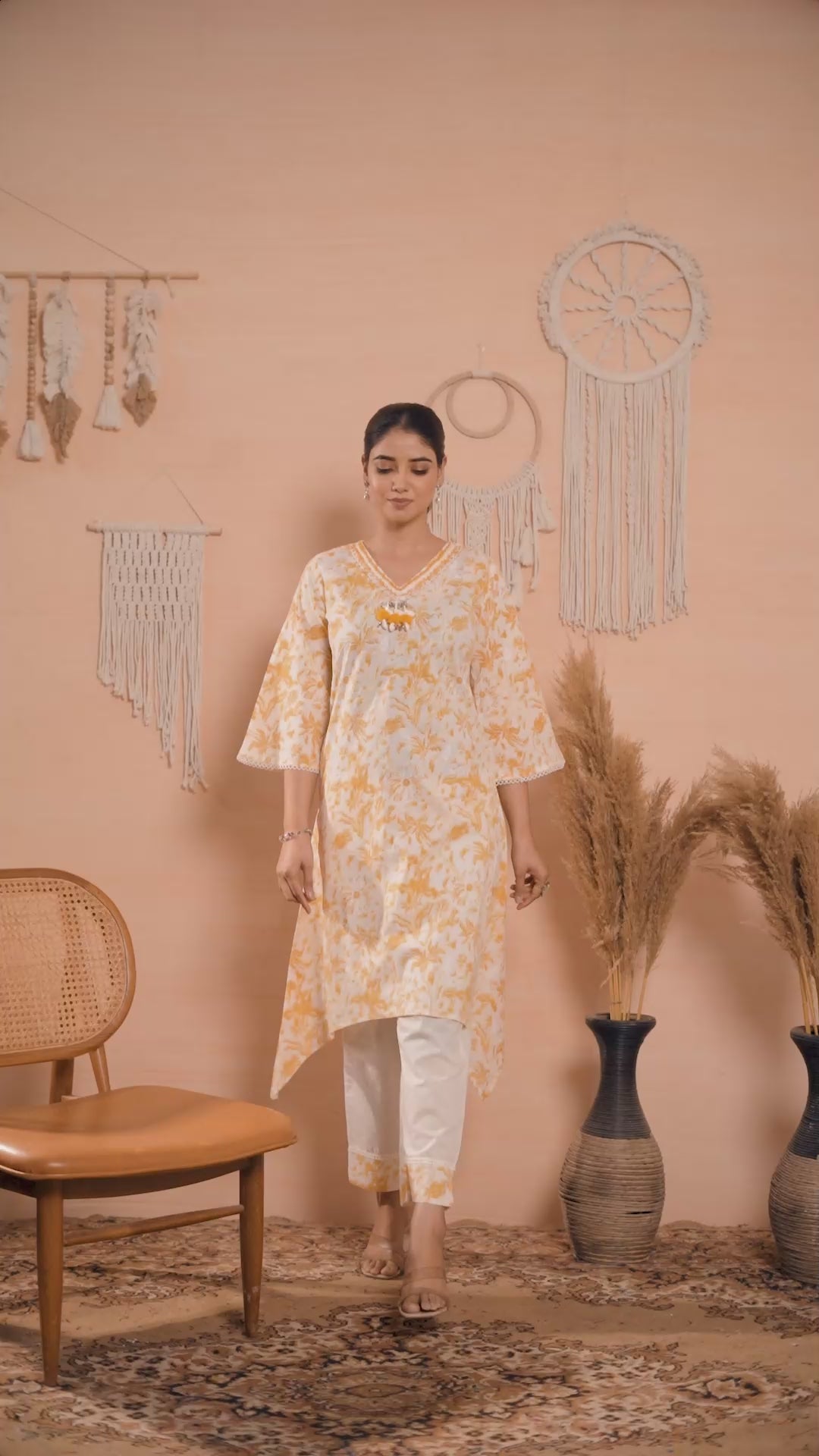 White & Mustard colored top bottom set is prettified with floral print with latkan on neck as shown which makes it appear classy. This top is made of pure cotton fabric which is accompanied with pure cotton bottom. Women can buy this set to wear for their casual, daily and office wear.