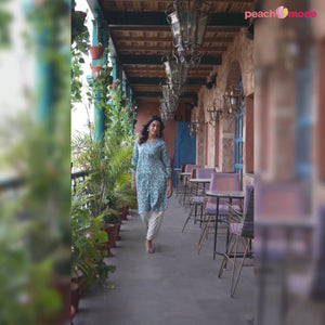 Turquoise Floral Printed Pure Cotton Straight Kurti |