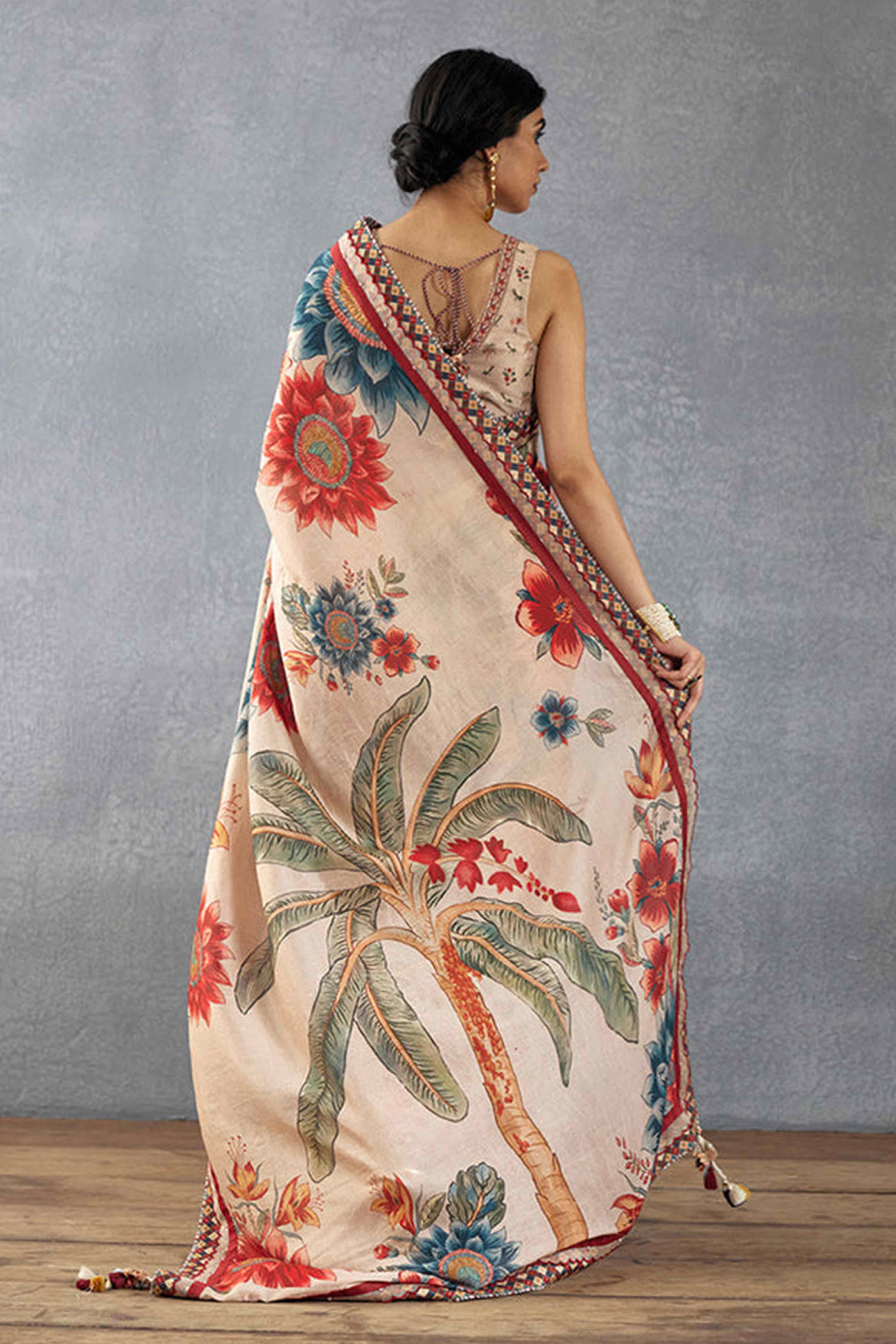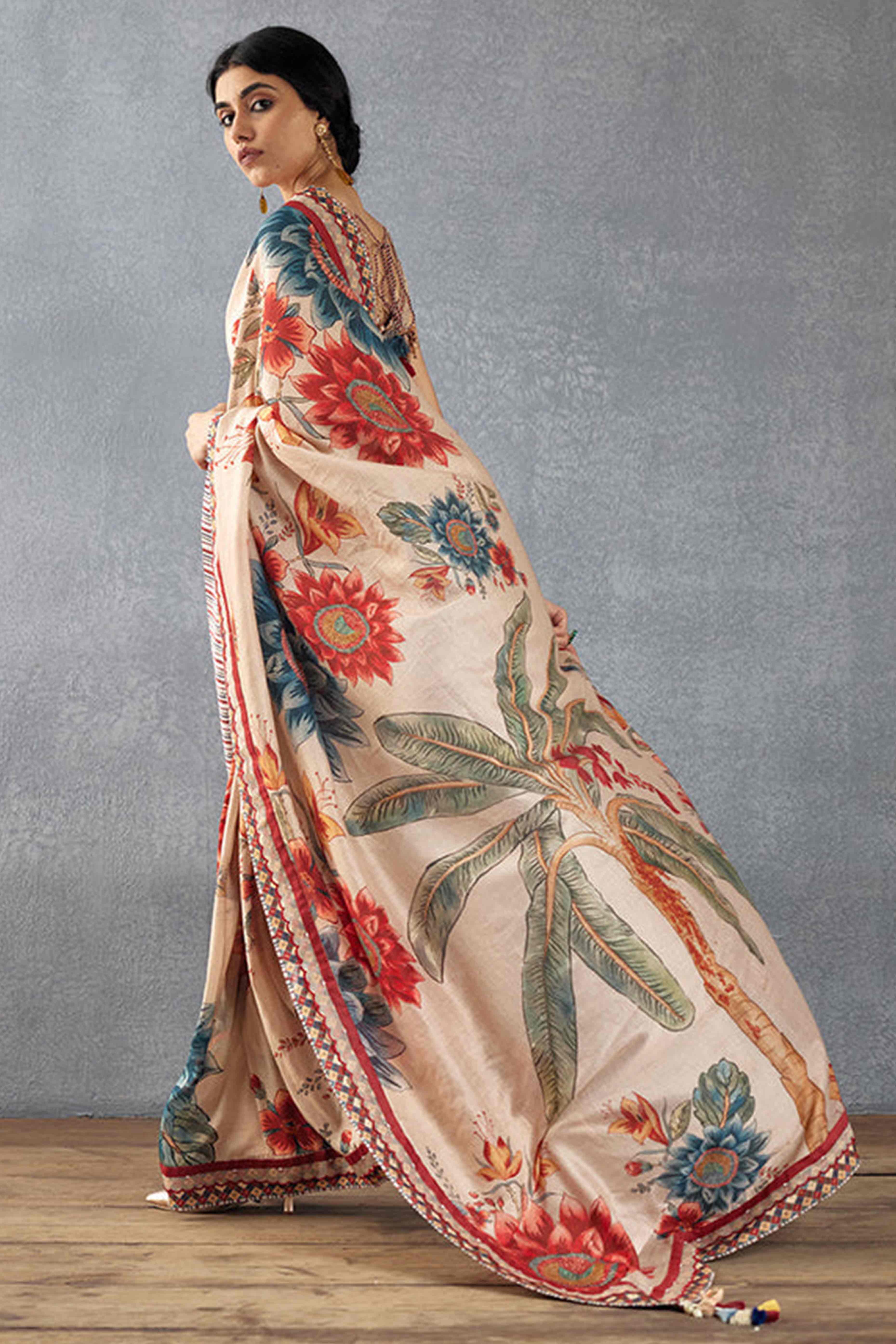 Beige colored saree is made from moss chiffon fabric which is highlighted with floral print and thread work on border as shown. Comes along with unstitched moss chiffon blouse piece which you can customise as per your design/style. Occasion - You can wear this saree for party and events.