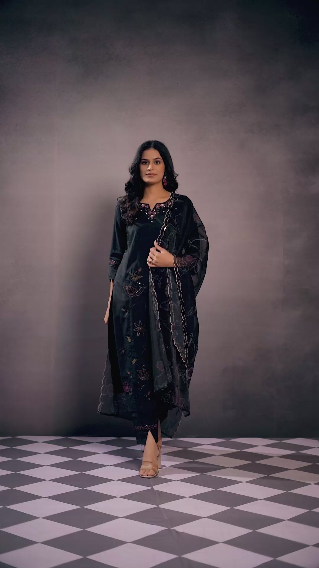 Black Sequins Embroidered Chanderi Silk Straight Salwar Suit