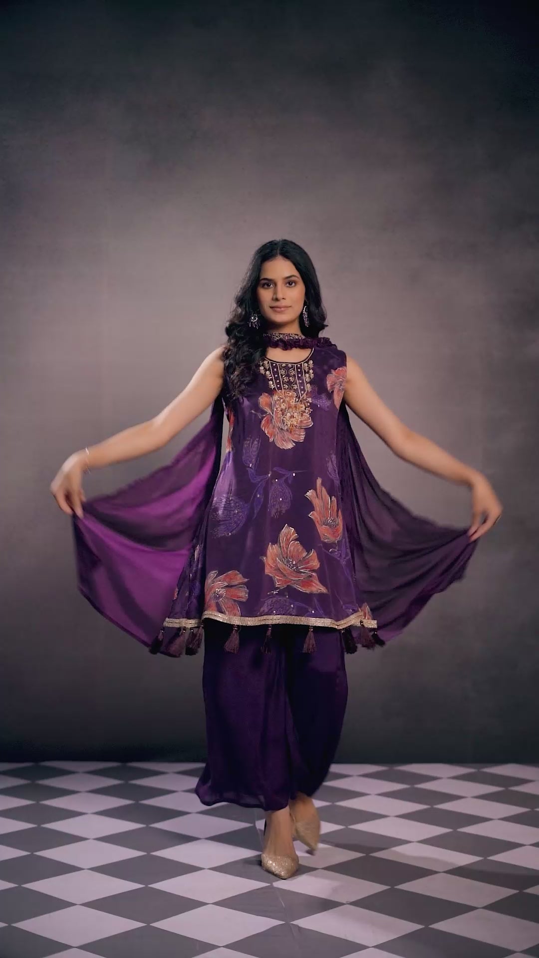 Dark Purple colored suit is prettified with floral print and bead work on neck as shown which makes it appear classy. This suit is made of chinon fabric which is accompanied with chinon bottom, santoon inner and chinon dupatta with frill work. Women can buy this suit to wear for their festive and functions.