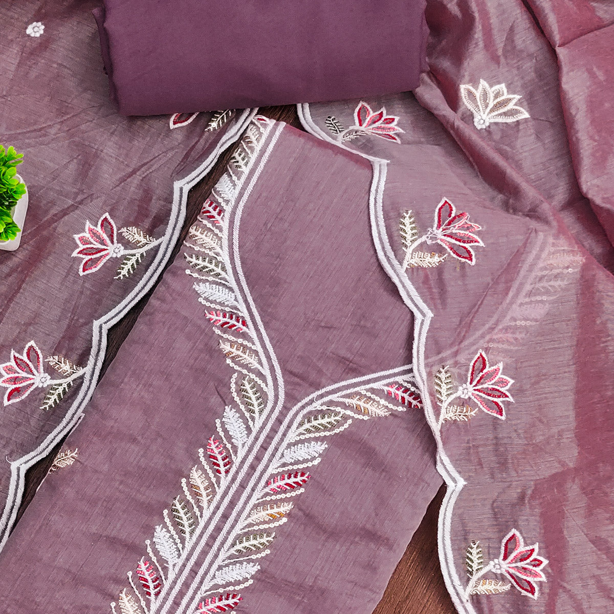 Elegant Lavender Chanderi Cotton Dress Material With Floral Thread Embroidery & Sequins
