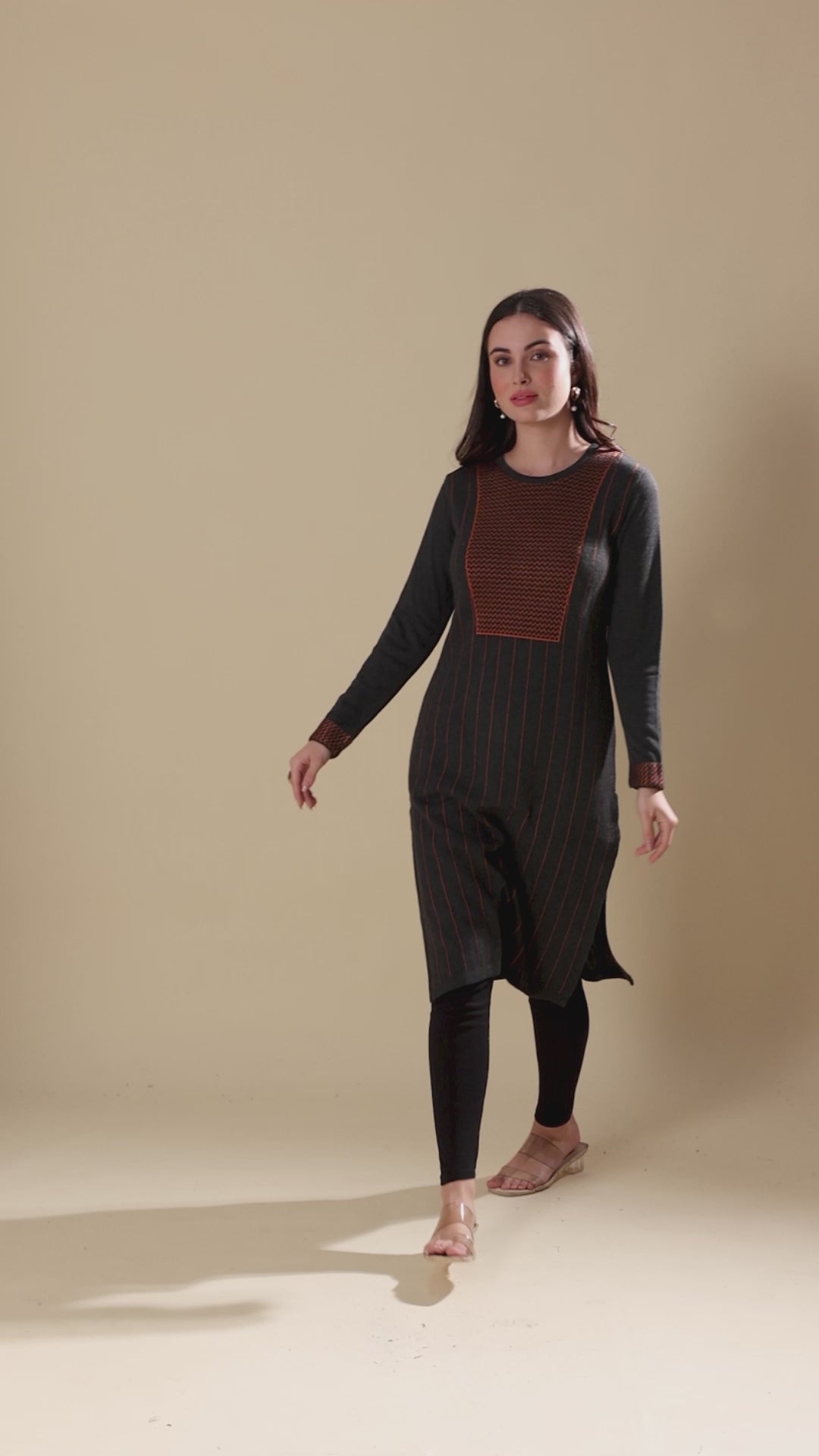 Grey colored kurti is fashioned on woolen fabric which is lightweight and assures the wearer a perfect fit & comfort. This stitched kurti is beautified with floral work on neck as shown. Ideal for casual, office wear and others.