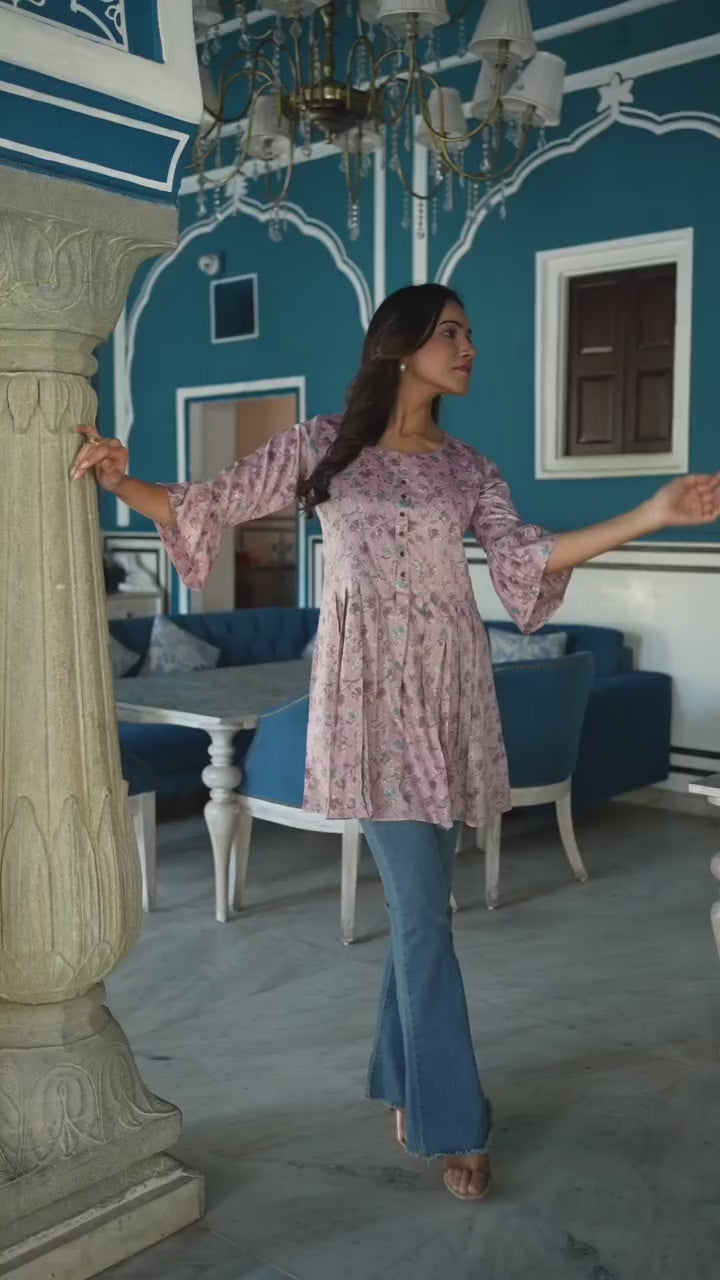 Light Purple colored top is prettified with floral foil printed work as shown which makes it appear classy. This top is made of rayon fabric. Women can buy this suit to wear for their casual, office wear and daily wear.