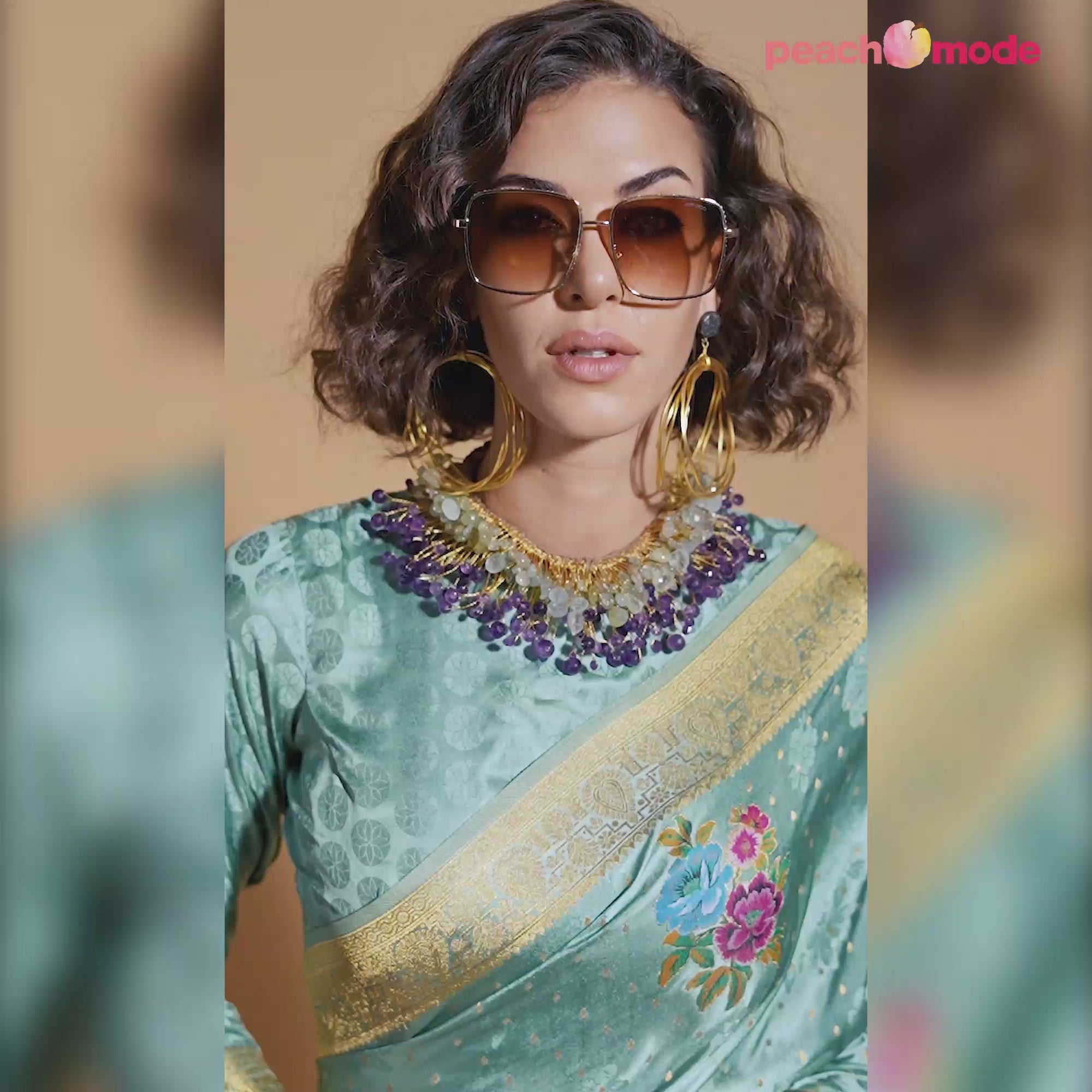 Light Turquoise Floral Woven Satin Saree With Tassels