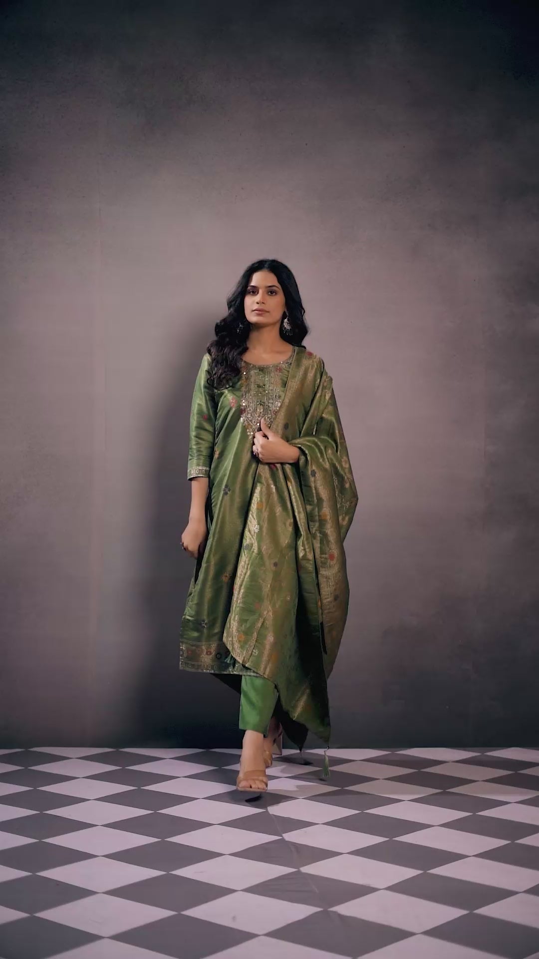 Mehandi green colored salwar suit is prettified with floral weaving work as shown which makes it appear classy. This top is made of shimmer fabric which is accompanied with pure santoon bottom, cotton inner and shimmer jacquard dupatta. Women can buy this set to wear for their festive and functions.