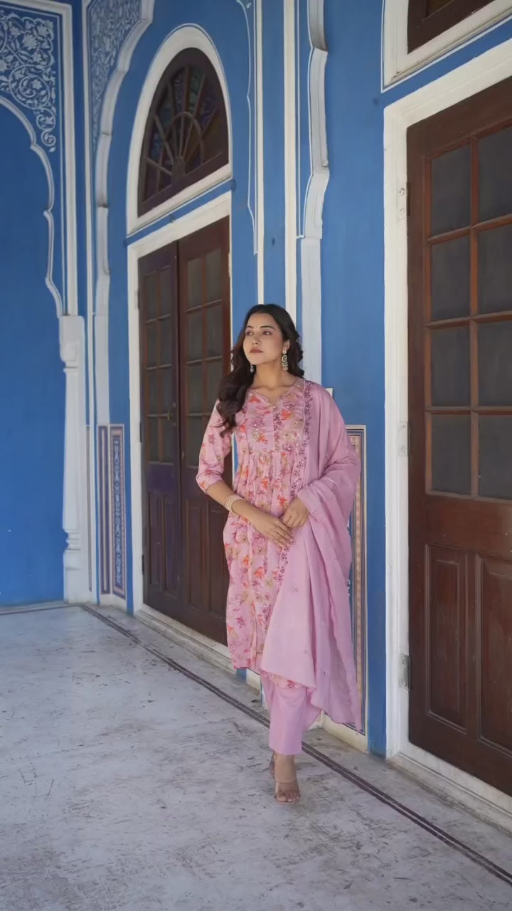 Peach colored suit is prettified with floral print with some handwork as shown which makes it appear classy. This top is made of pure cotton fabric which is accompanied with cotton bottom and mulmul cotton dupatta. Women can buy this suit to wear for their festive and functions.