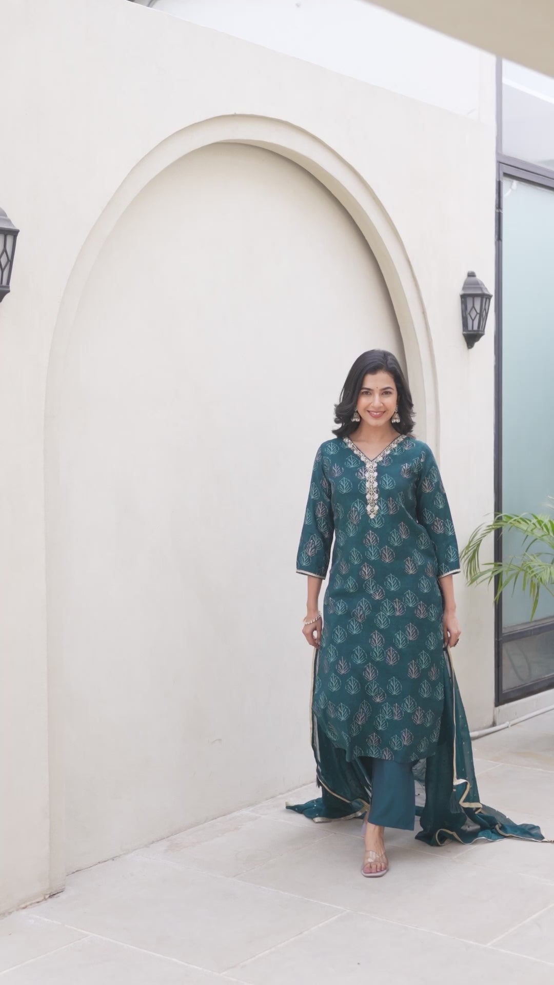 Teal Foil Printed Chanderi Straight Salwar Suit