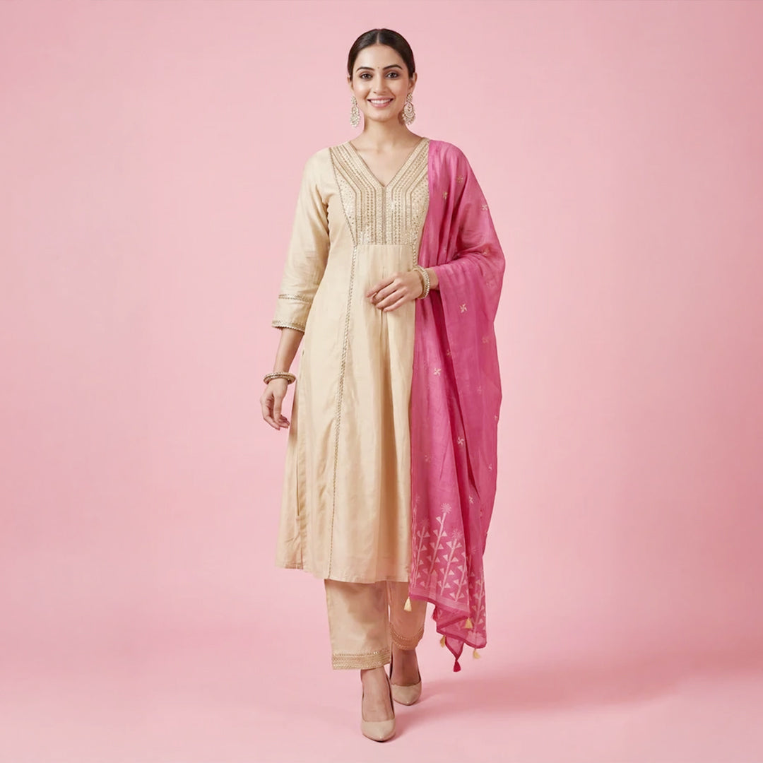 Beige Embroidered Vichitra Silk Anarkali Salwar Suit |