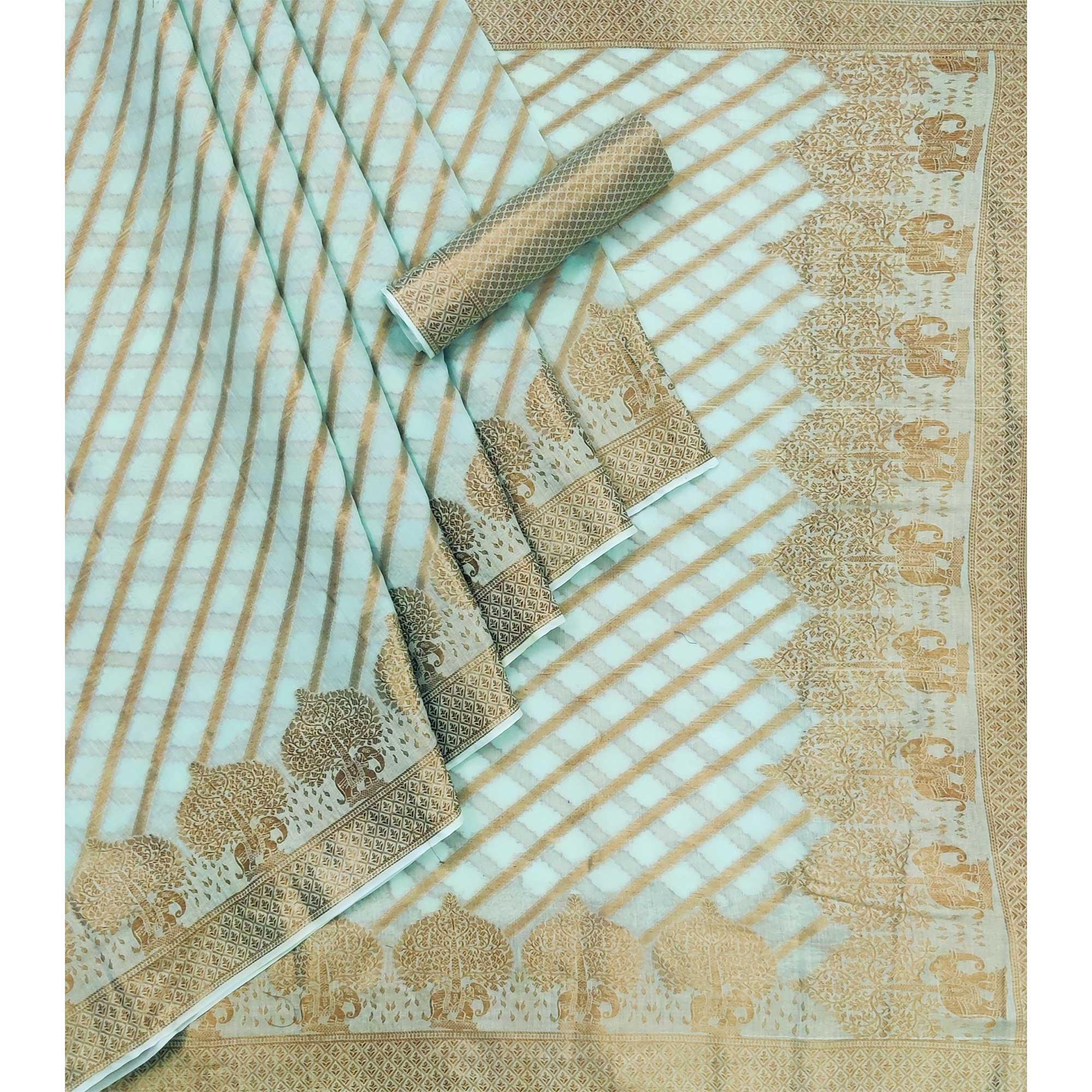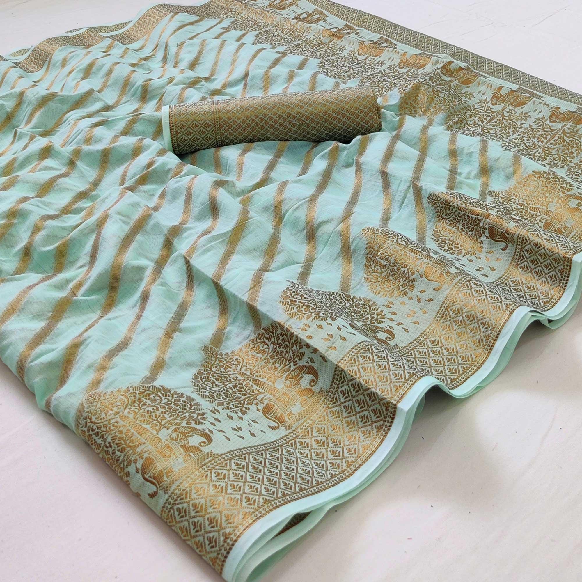 This blue colored saree is prettified with stripes weaving work as shown which makes it appear classy. This saree is made of poly cotton fabric which is accompanied with poly cotton blouse piece which you can customise as per your design/style. Women can buy this saree to wear for their festive, homely events and ideal for any fashionista. Note:- The actual product may differ slightly in color and design from the one illustrated in the images when compared with computer or mobile screen.