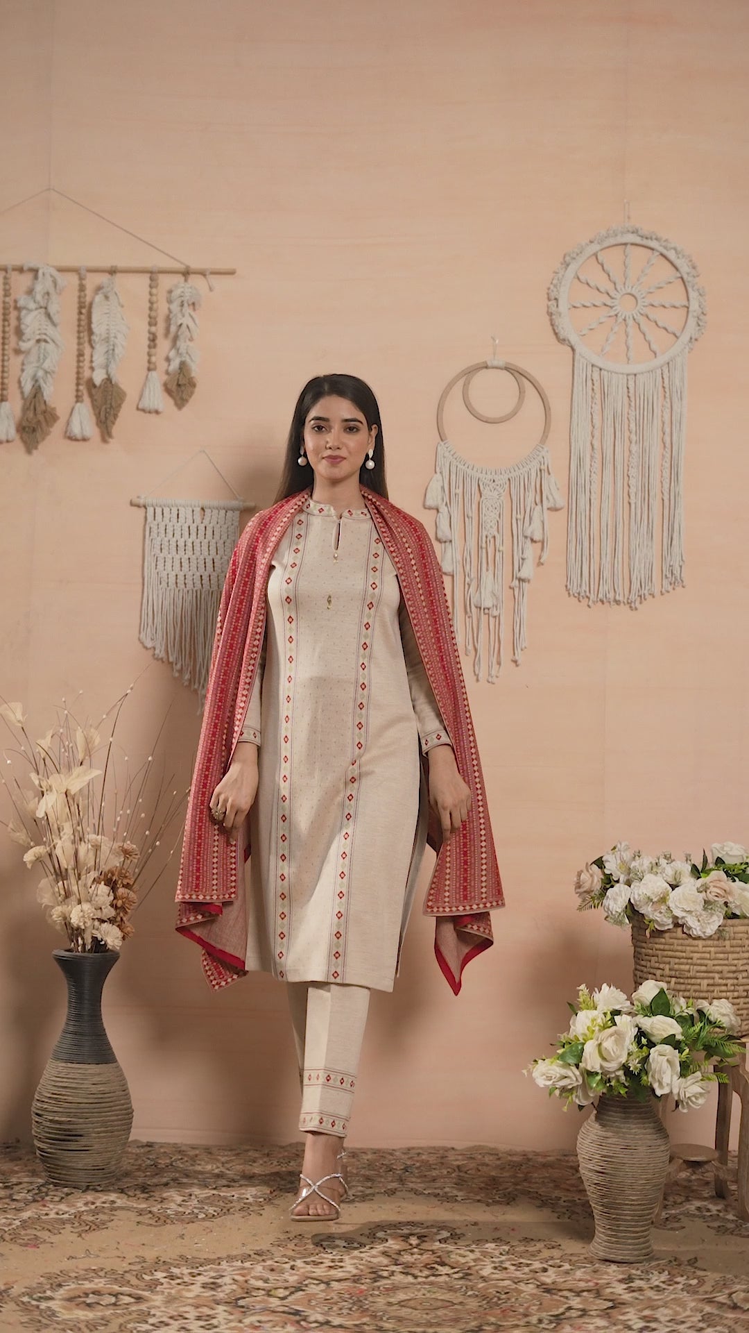 Beige colored suit is prettified with weaving work as shown which makes it appear classy. This top is made of woolen fabric which is accompanied with woolen bottom and woolen dupatta. Women can buy this suit to wear for their festive, functions and events.