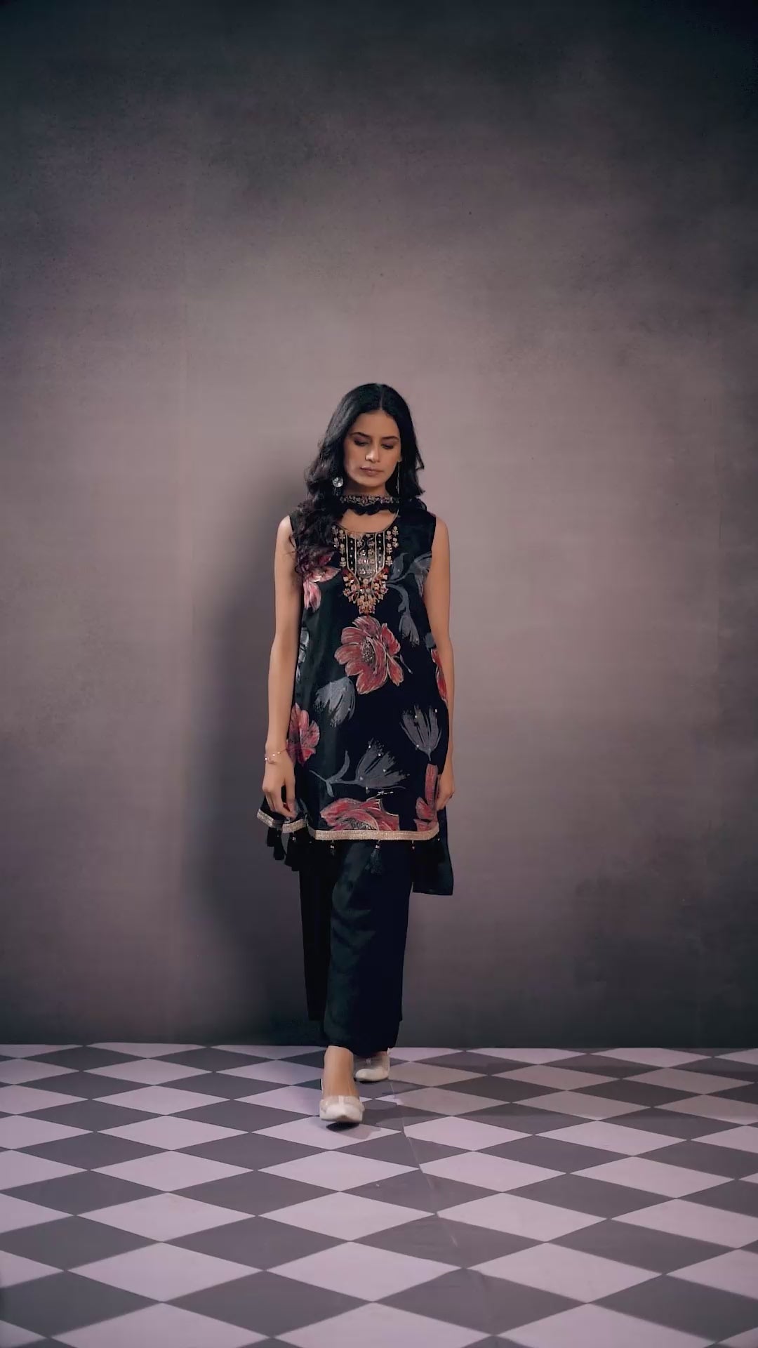 Black Floral Printed Beads Work Pure Chinon A-Line Salwar Suit