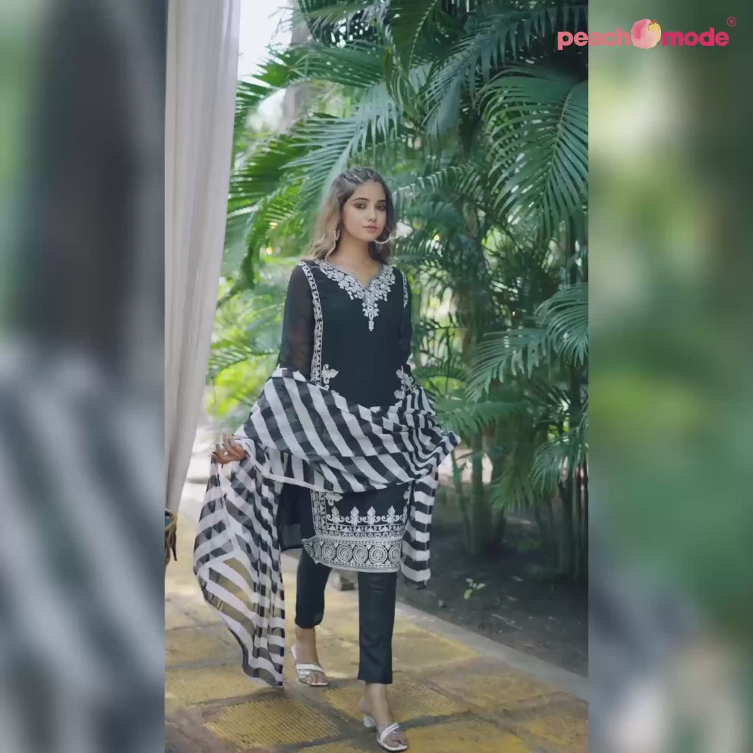 Black colored suit is prettified with lucknowi embroidered work as shown which makes it appear classy. This top is made of georgette fabric which is accompanied with santoon bottom, santoon lining and georgette dupatta. Women can buy this suit for their festivals and functions.