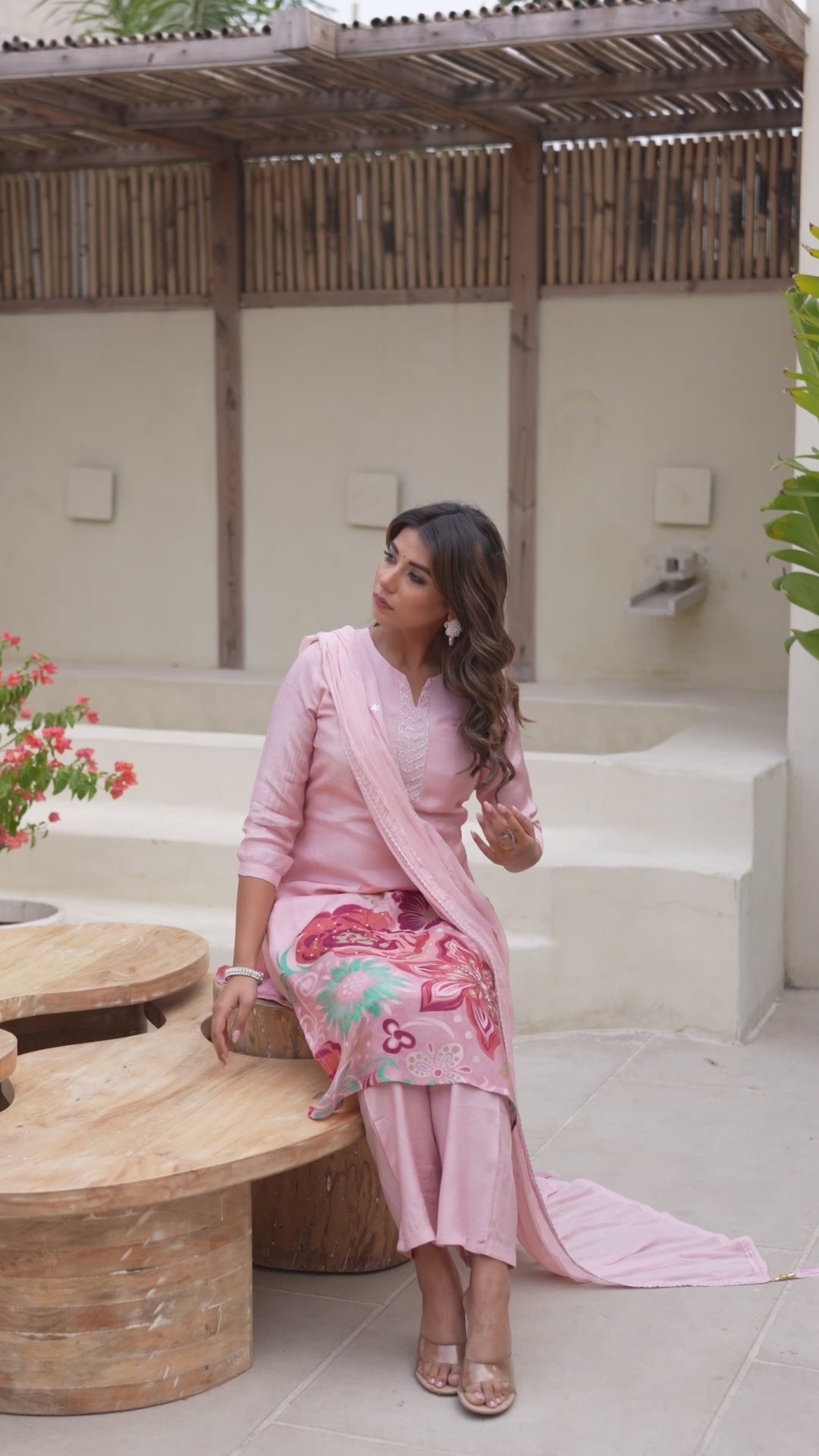 Blush Peach Floral Printed Muslin Straight Salwar Suit With Handwork