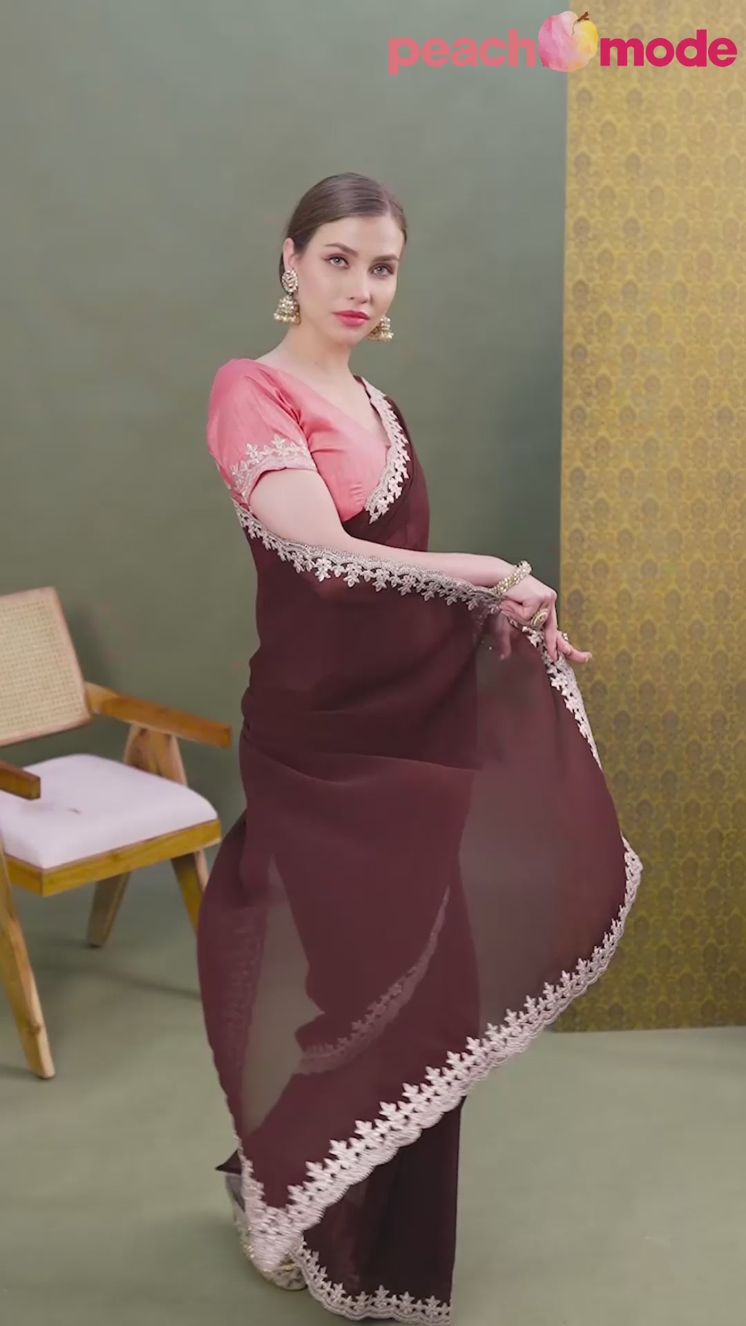 Brown Solid With Zari Embroidered Georgette Saree