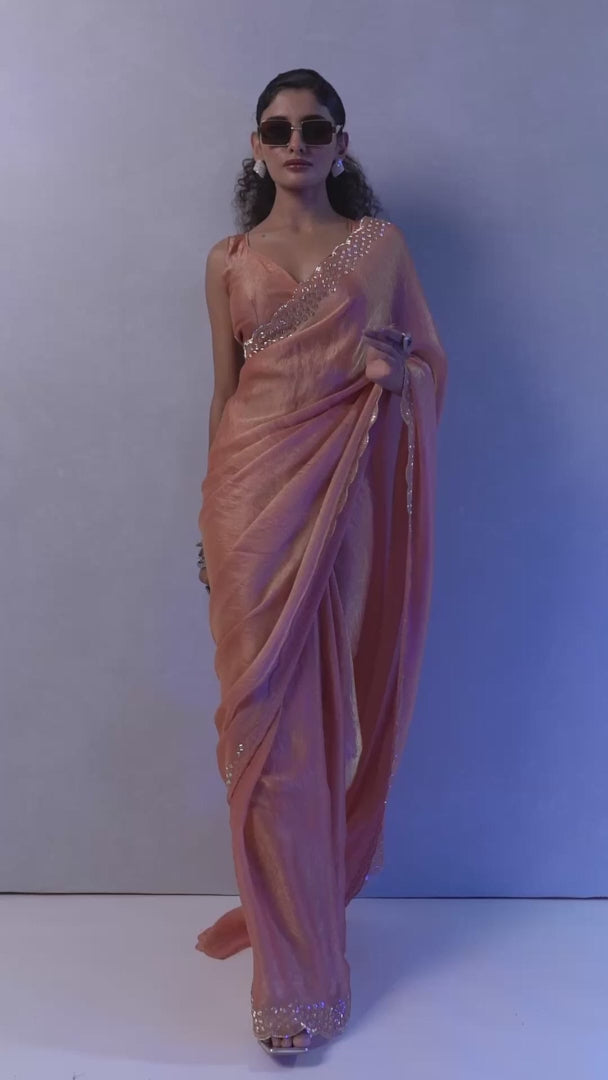 - Elegant Look: Coral peach colored saree crafted from luxurious satin chiffon fabric, embellished with refined stone work for a graceful appearance.
