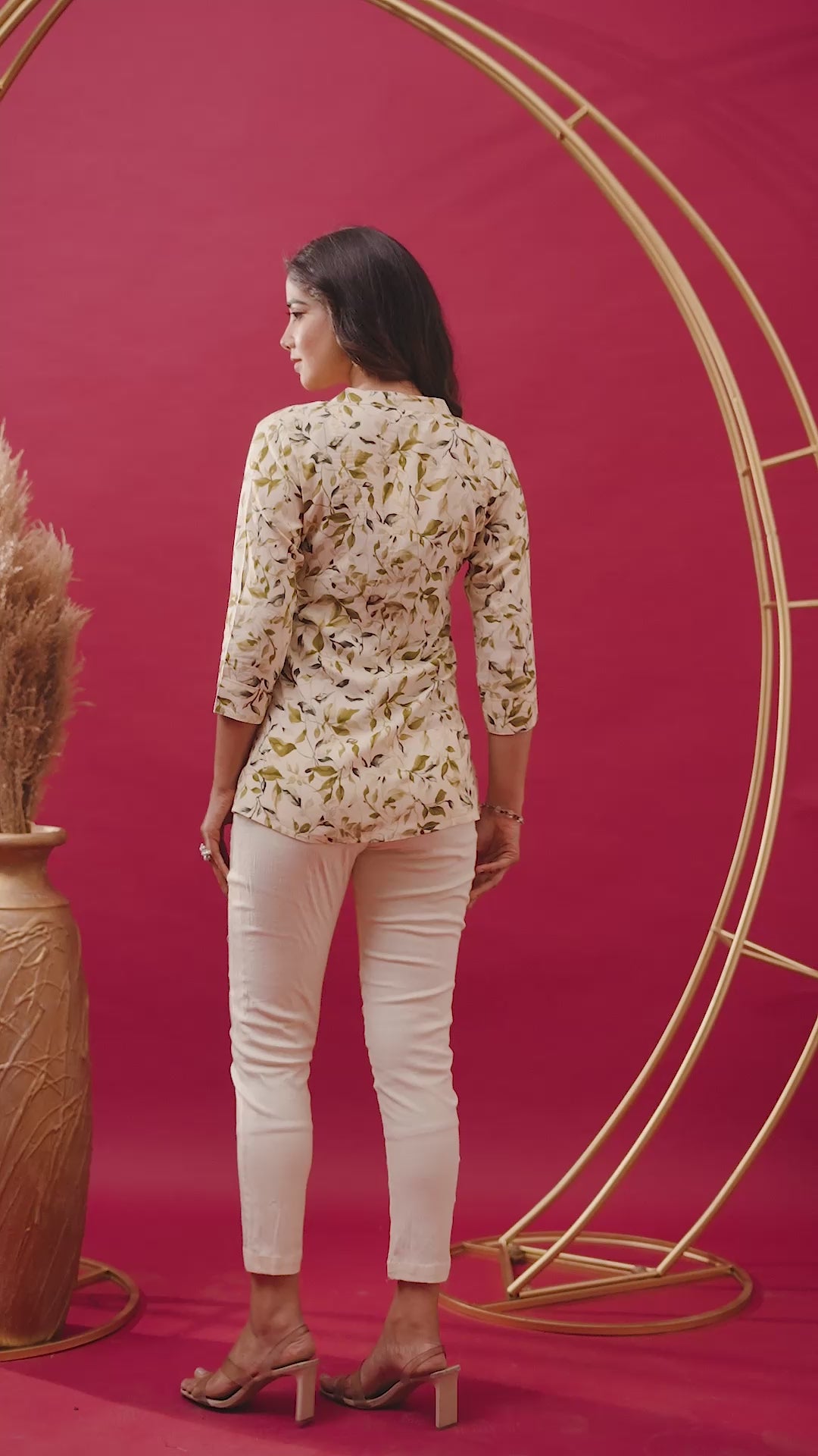 Cream & Olive colored top is fashioned on rayon fabric which is lightweight and assures the wearer a perfect fit & comfort. This stitched top is beautified with printed work as shown. Ideal for daily, office, casual & weekend get together.