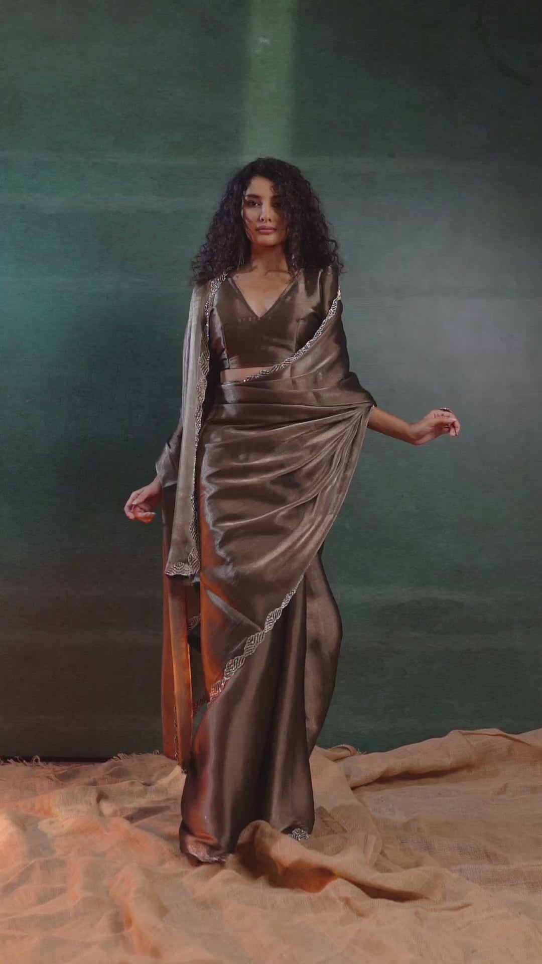 Dark Brown Solid Tissue Chiffon Saree Accentuated With A Sparkling Zarkan Work Border