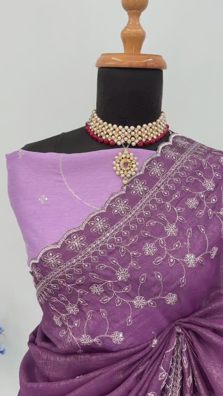 Dusty Lavender  Silk Blend Crush Saree Adorned With Floral Thread Embroidery & Sequins
