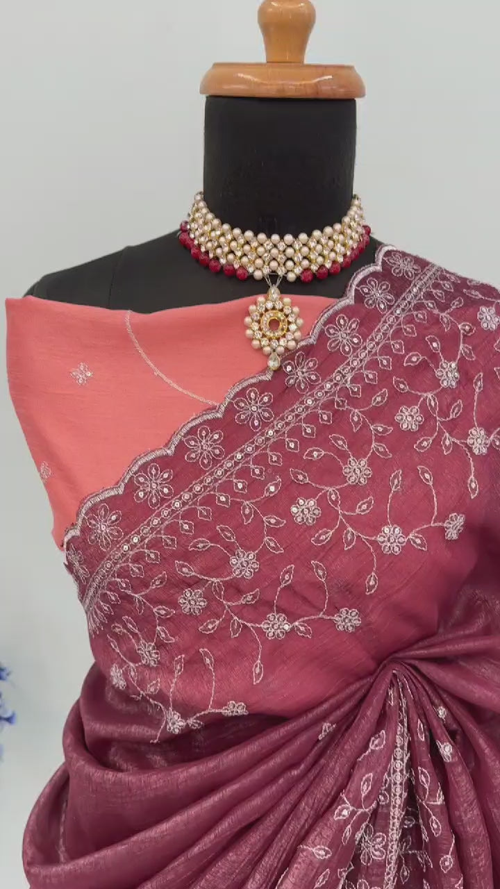 Dusty Maroon Silk Blend Crush Saree Adorned With Floral Thread Embroidery & Sequins