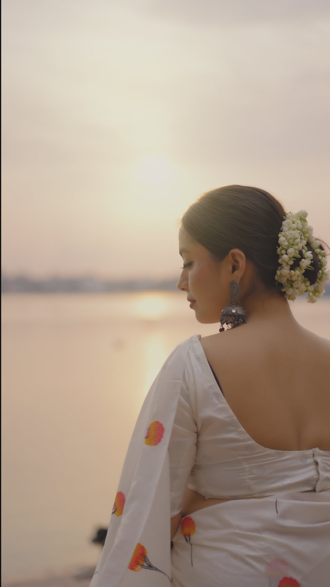Elegant White Banarasi Silk Saree With Floral Zari Weaving & Tassel Border