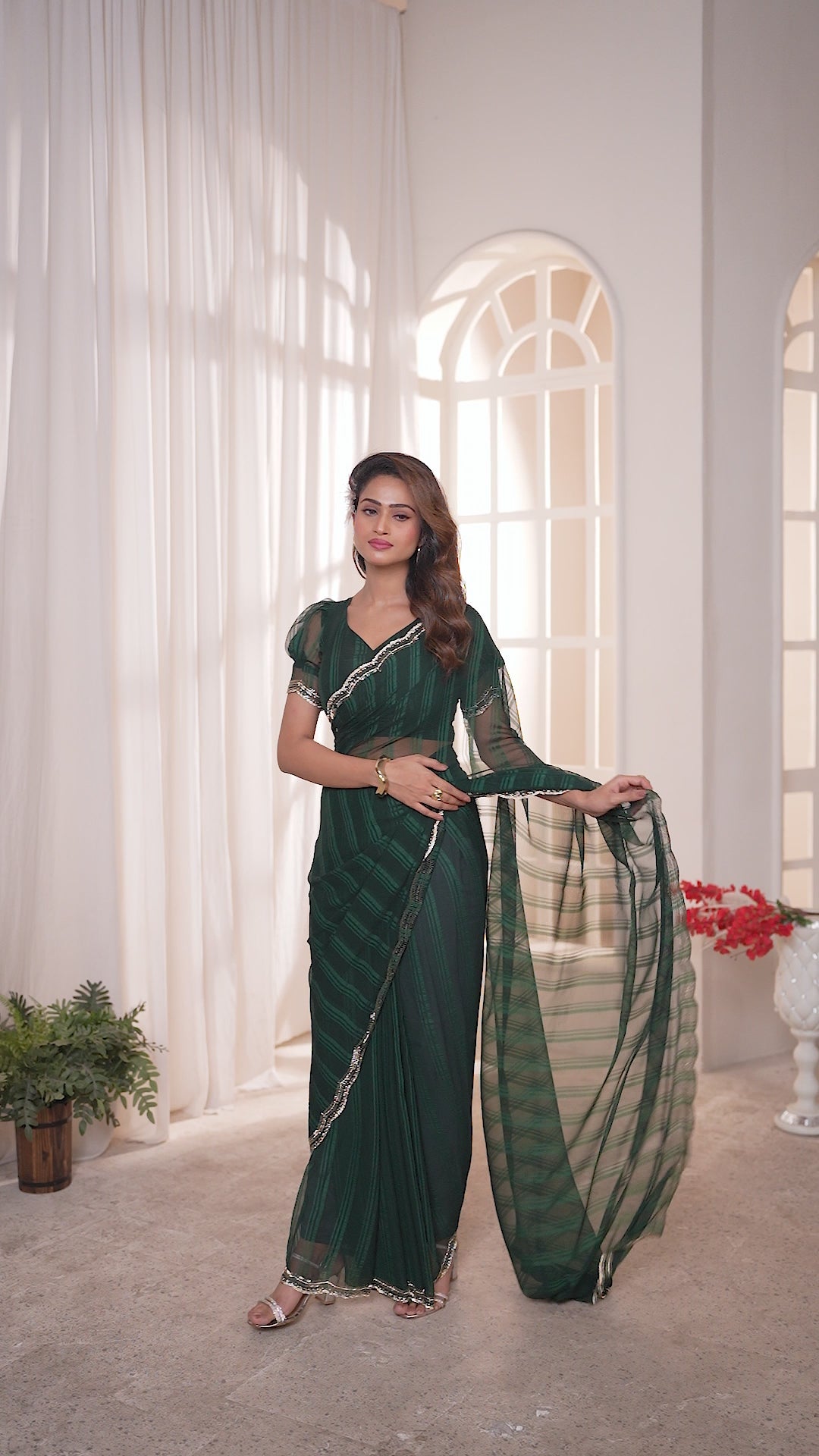 Green Georgette Saree Featuring Contemporary Stripes With A Sparkling Diamond & Beads Work Border