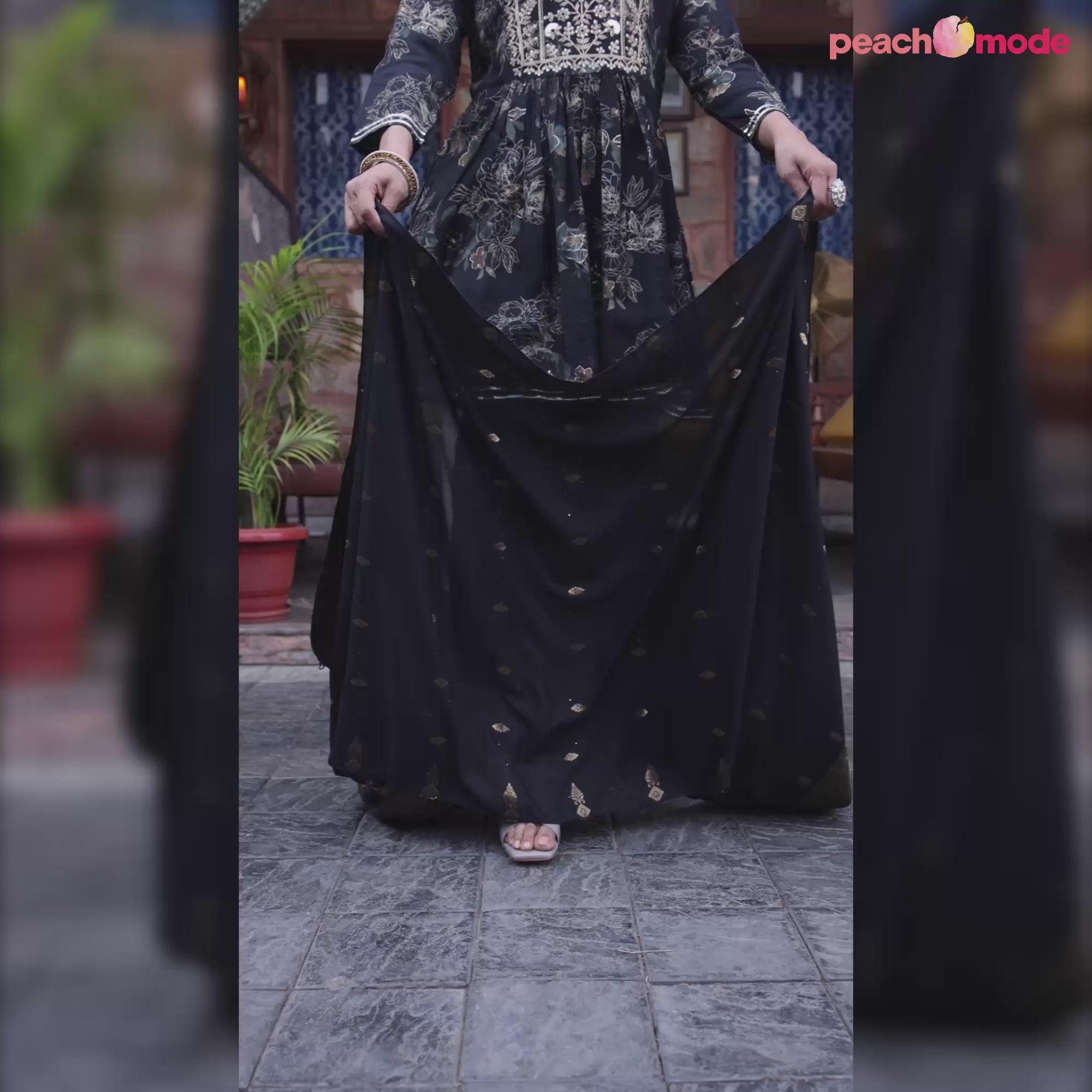 Black colored suit is prettified with floral print work as shown which makes it appear classy. This top is made of chanderi silk fabric which is accompanied with chanderi silk bottom and muslin with jacquard dupatta. Women can buy this suit to wear for their festive, parties and functions.