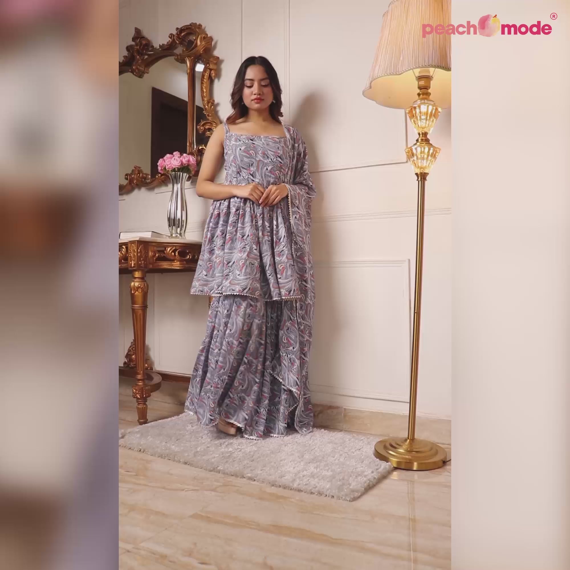 Grey colored suit is prettified with abstract print and gota patti border work as shown which makes it appear classy. This top is made of georgette fabric which is accompanied with georgette bottom and dupatta. Women can buy this suit to wear for their parties and functions.