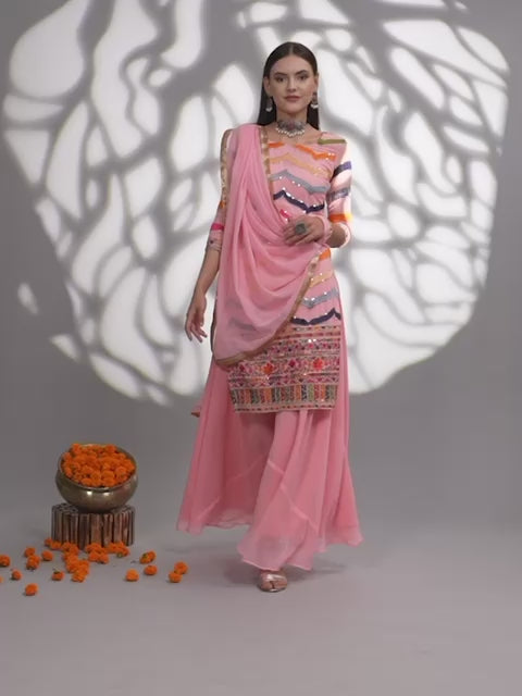 Pink colored suit is prettified with sequins, thread and mirror work as shown which makes it appear classy. This top is made of georgette fabric which is accompanied with georgette bottom, crepe lining and georgette dupatta. Women can buy this suit to wear for their parties and functions.