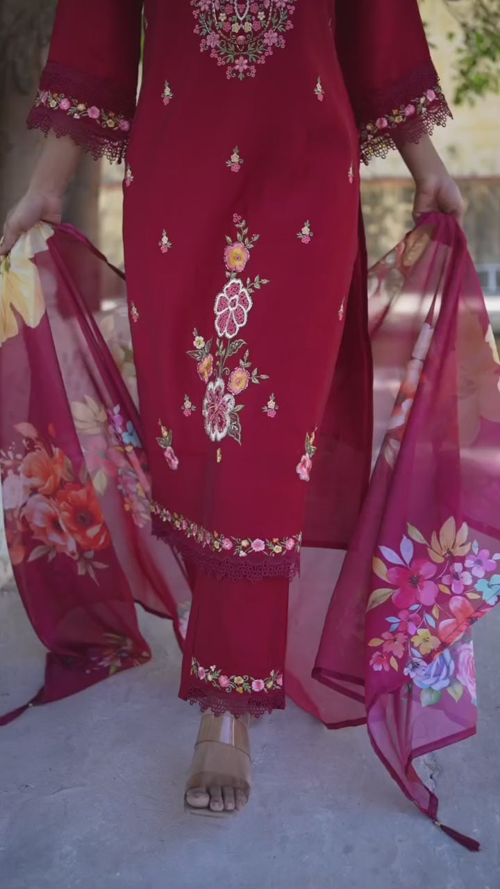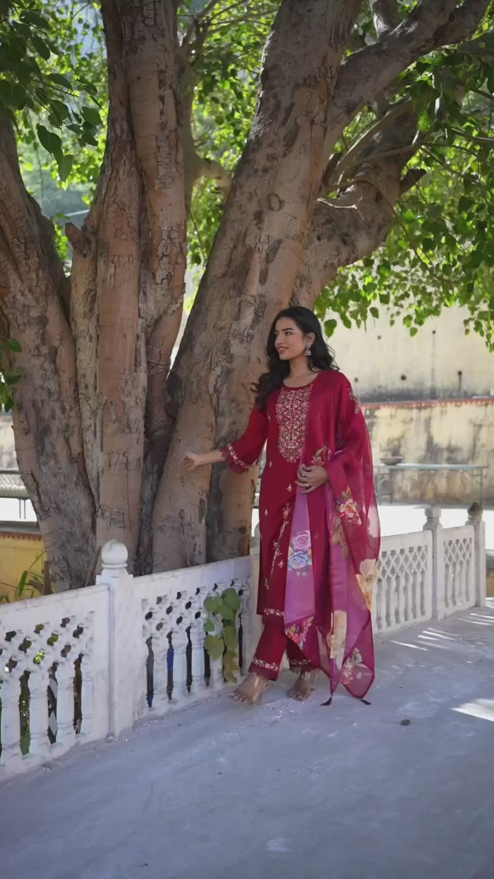 Maroon colored suit is prettified with floral embroidered work as shown which makes it appear classy. This top is made of chanderi silk fabric which is accompanied with chanderi silk bottom and organza dupatta. Women can buy this suit to wear for their festive and functions.