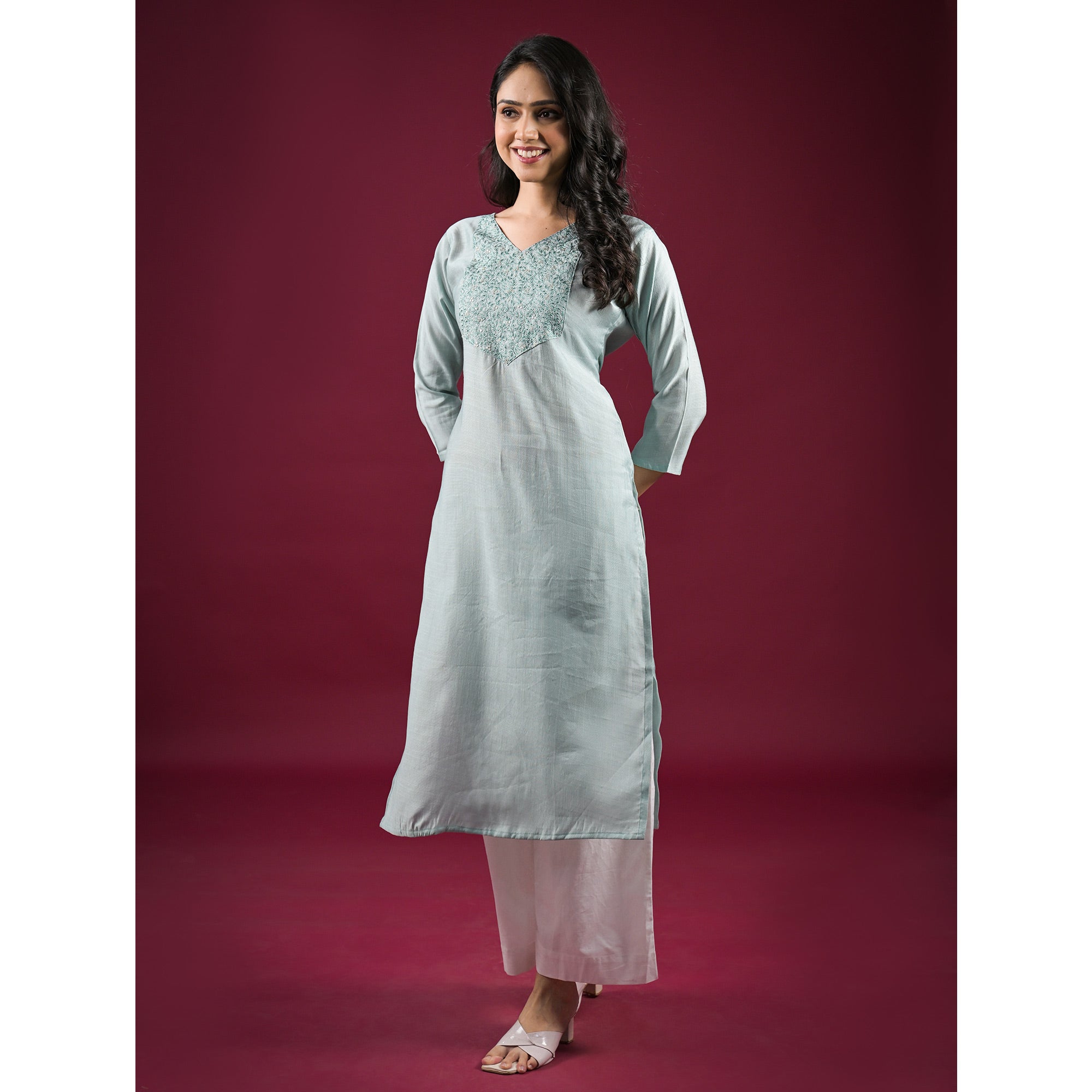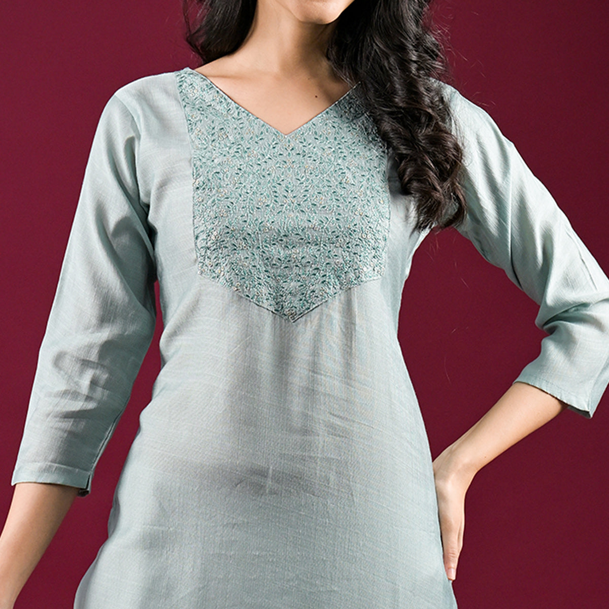 Mint Green Yoke Embroidered Viscose Straight Kurti