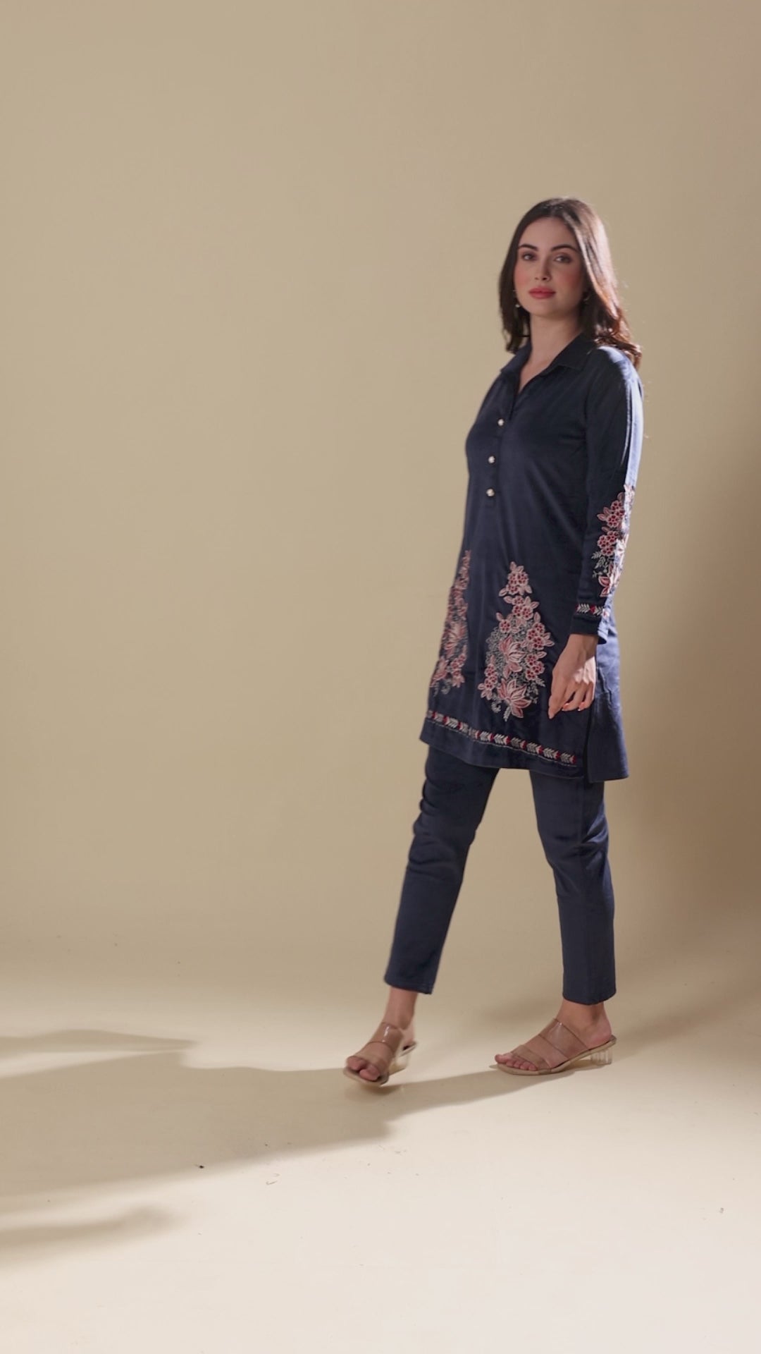 Navy Blue Embroidered Velvet Straight Top Bottom Set