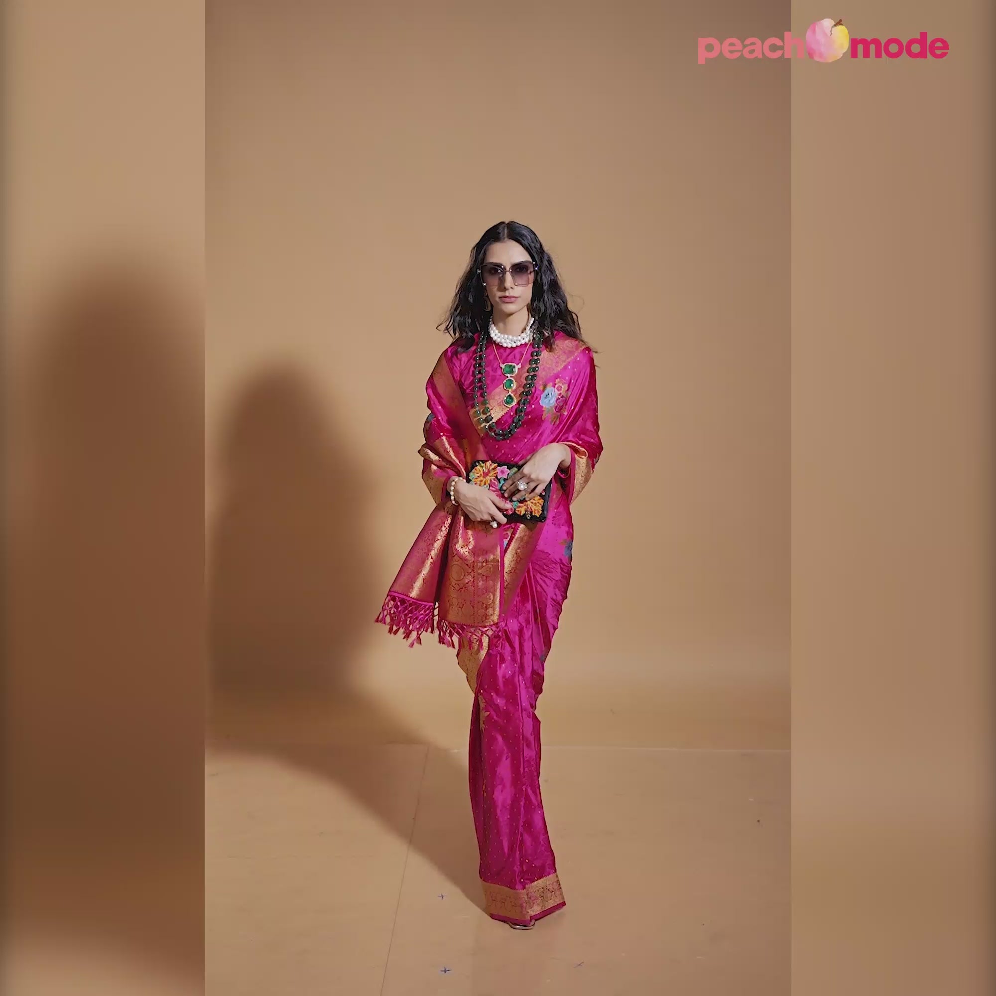 Pink Floral Woven Satin Saree With Tassels
