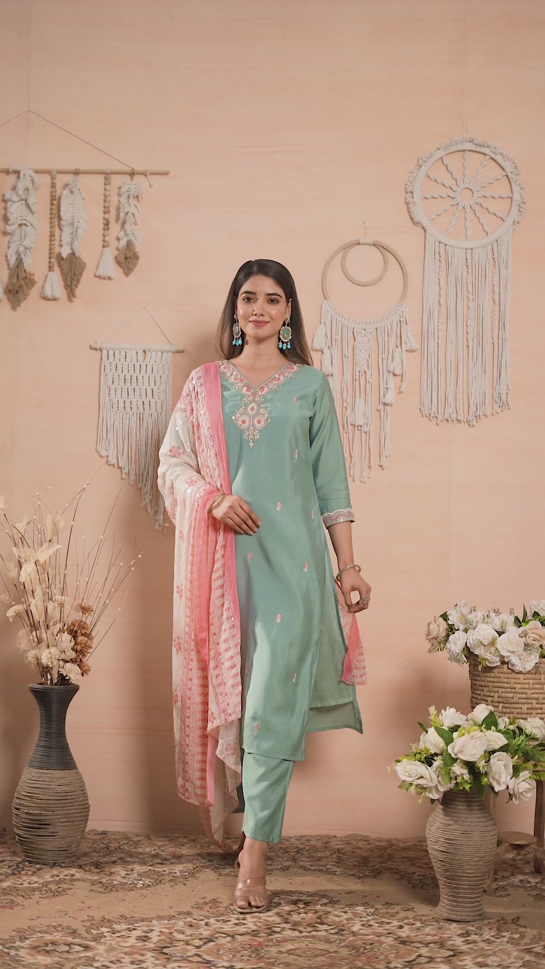 Sea Green Beads Embroidered Chanderi Silk Straight Salwar Suit