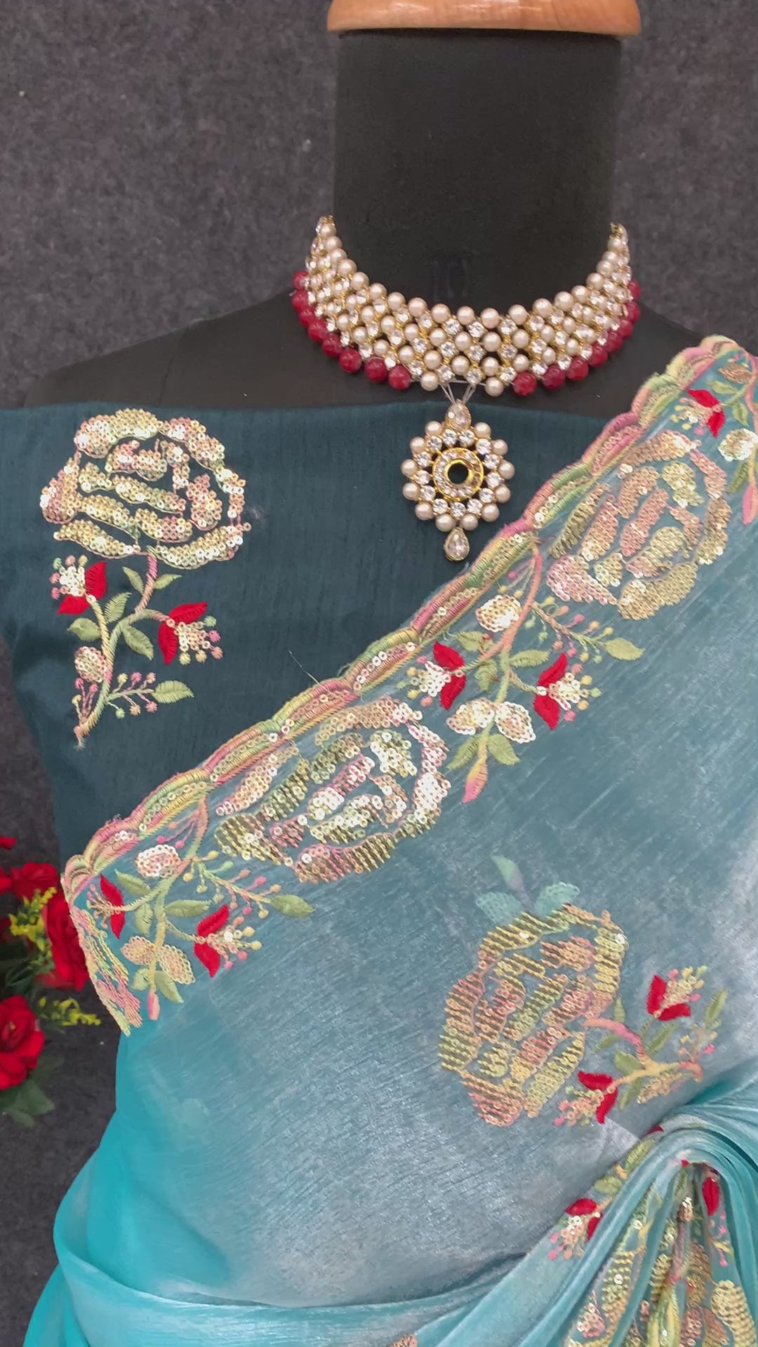 Sky Blue Sequins Work Embroidered Chiffon Saree