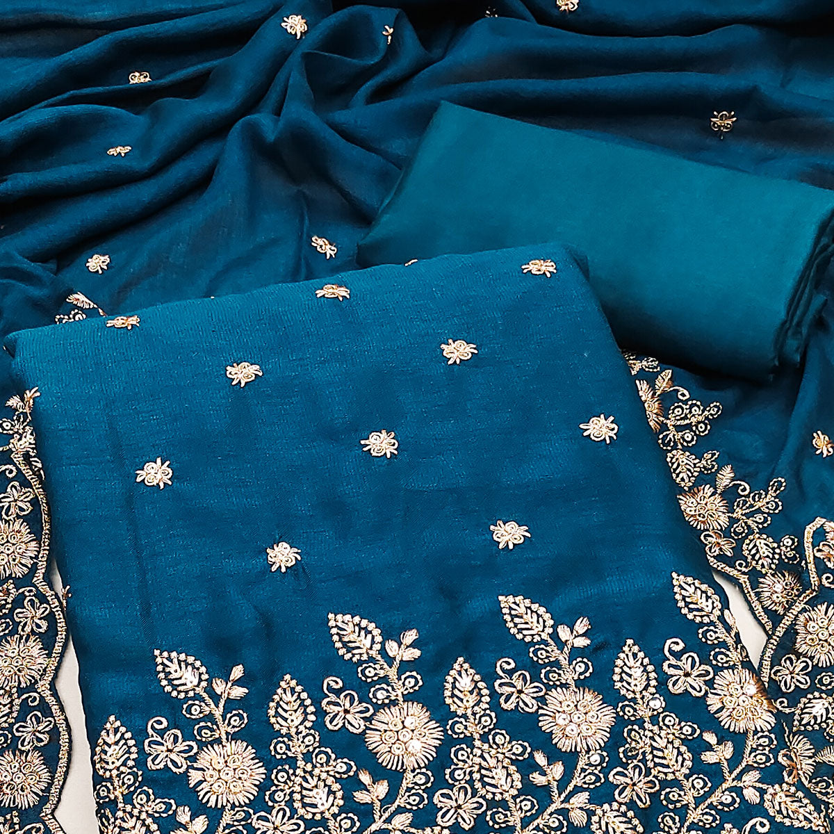 Teal Vichitra Silk Dress Material with Rich Threadwork