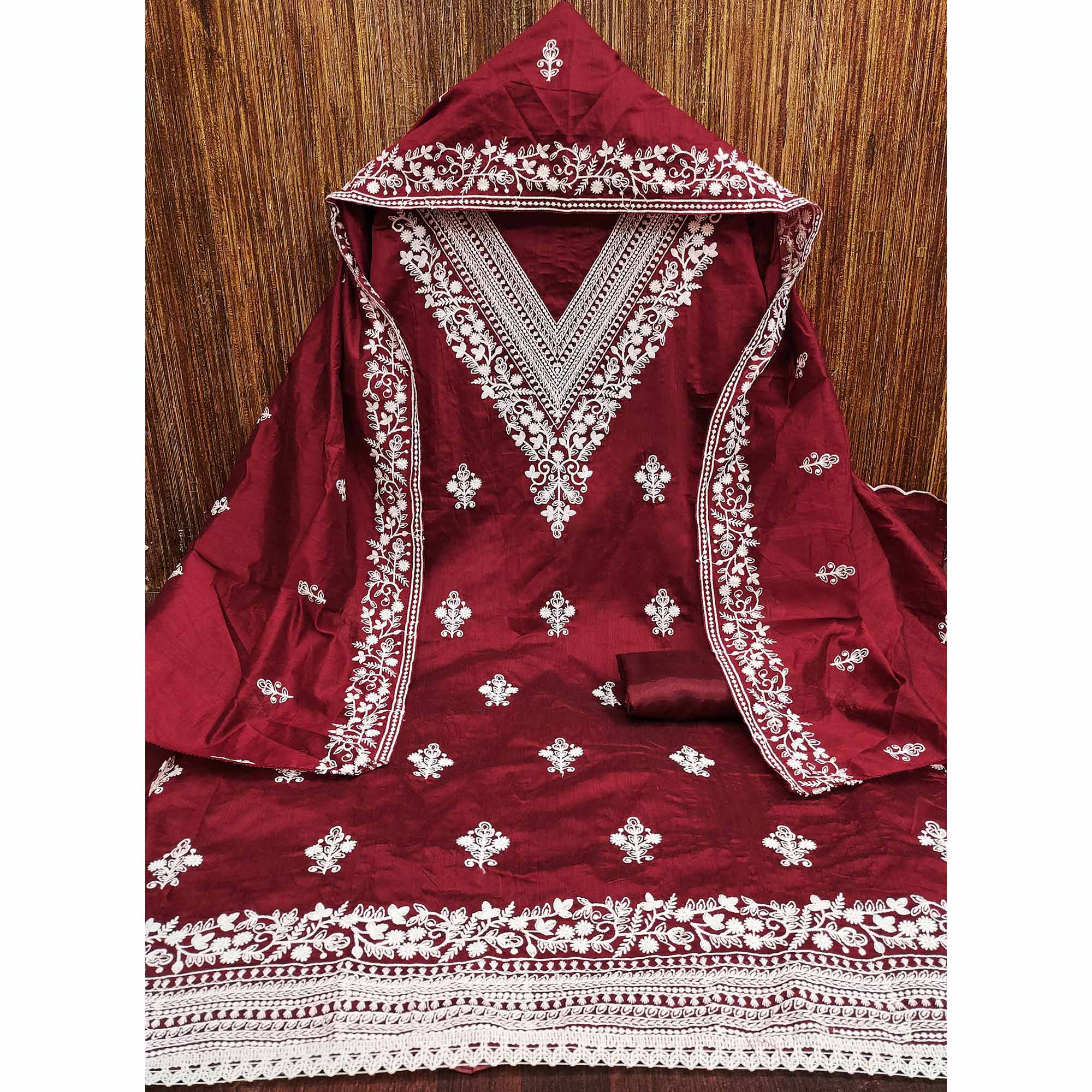 - Vibrant Elegance: Maroon colored suit adorned with floral embroidered work, showcasing a classy and festive style as shown.