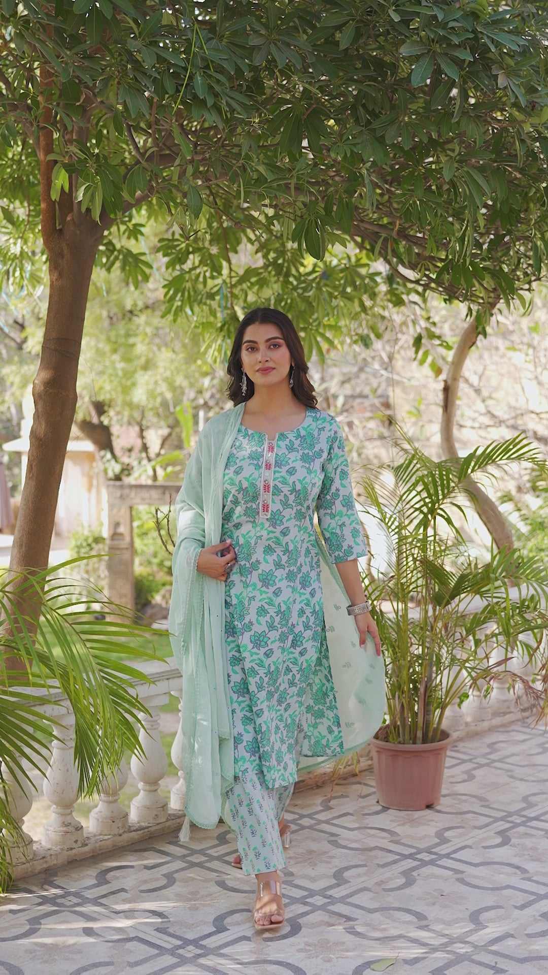 Turquoise colored suit is prettified with floral printed work as shown which makes it appear classy. This top is made of pure cotton fabric which is accompanied with pure cotton bottom and pure cotton dupatta. Women can buy this suit to wear for their casual, office wear and others.